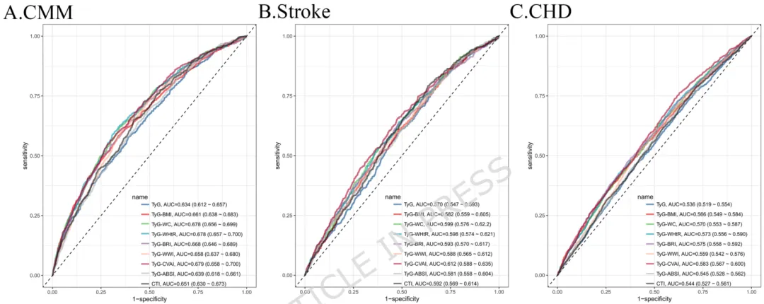 图4 TyG相关指标对CMM(A)、脑卒中(B)和冠心病(C)的预测性能