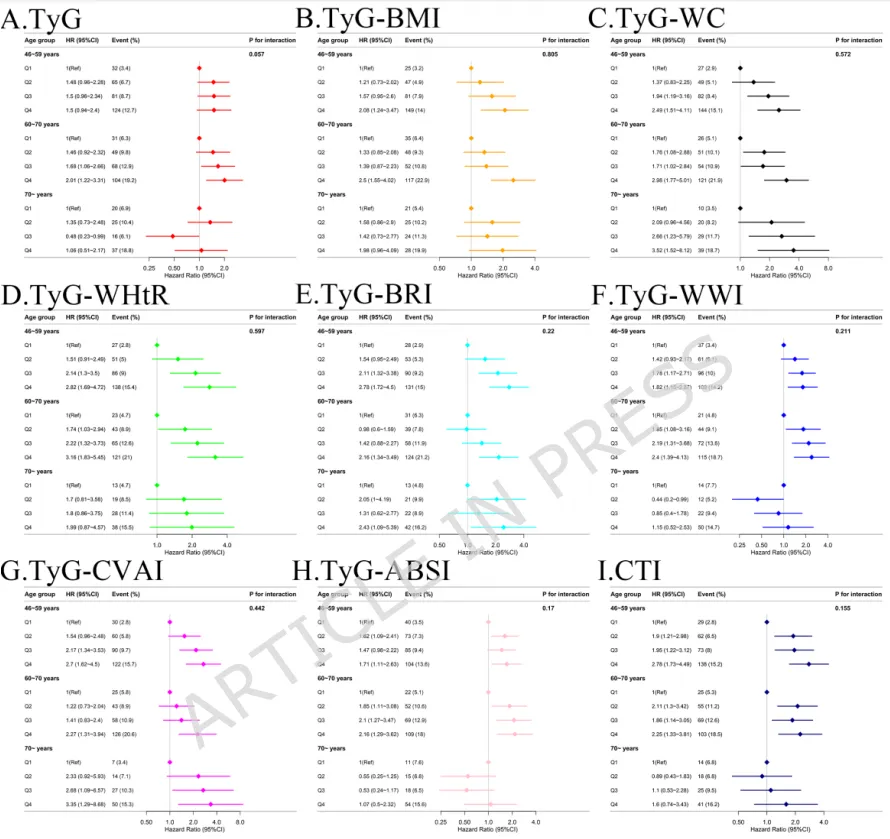 在≥70岁高龄组中,关联性普遍减弱,但TyG-BMI、TyG-WC、TyG-WHtR和TyG-CVAI仍保持稳定的预测关联。