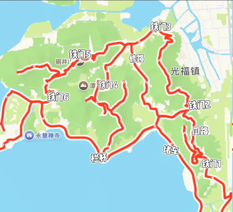 ⛰️ 本次骑行的核心亮点当属苏州光福七尖——这条盘踞在太湖边的山脊线,向来是徒步爱好者的专属天堂,唯有极少数“冒险者”会选择在此骑行挑战!
