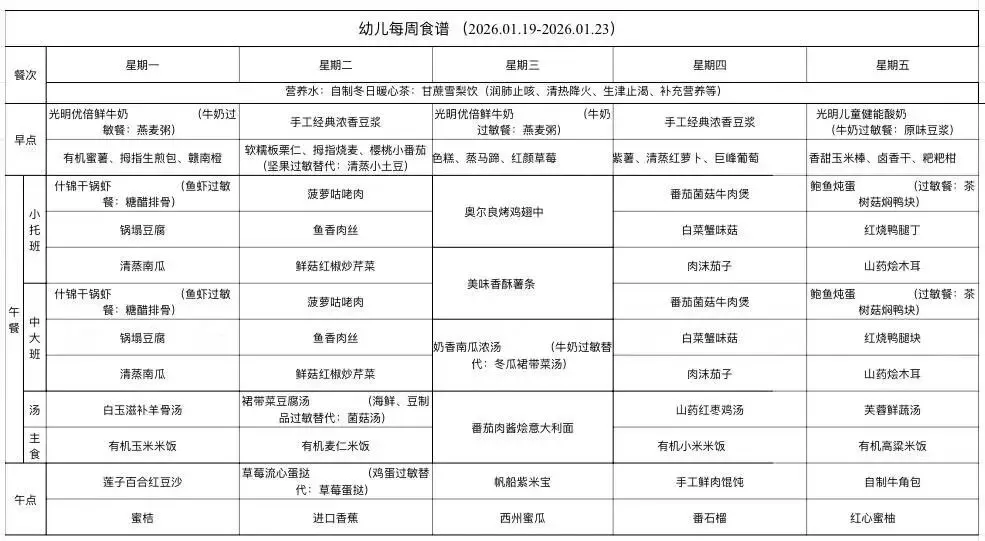 苏州道雅蒙氏幼儿园食谱2026.01.19-2026.01.23