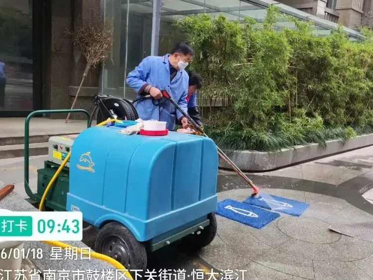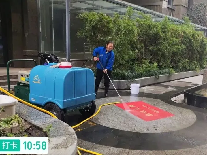 随着业主们陆续到场,清洗工作正式启动。工作人员接过一张张沾满尘土的地垫,认真登记业主信息后,便投入紧张的清洗工作中:先用高压水枪冲去表面浮尘,再均匀喷洒环保清洗剂,随后弯腰俯身,用地刷反复刷洗纹路缝隙,遇到顽固污渍,更是蹲下身用软毛刷细细擦拭,确保清洁无死角。