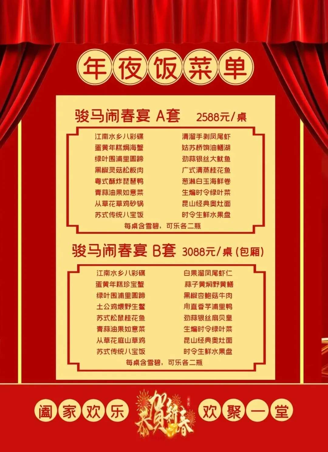 3、用餐:小年夜、大年夜出发含2588元/桌年夜饭(包厢+500元/桌)