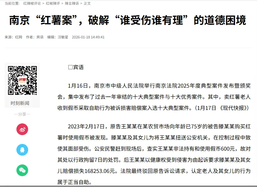 本文首发于今天(1月18日)红网-红辣椒评论。本号发布时内容有修改。原标题是《南京“红薯案”,破解“谁受伤谁有理”的道德困境》。文章链接:https://hlj.rednet.cn/content/646045/52/15624414.html ;https://moment.rednet.cn/content/646045/52/15624414.html