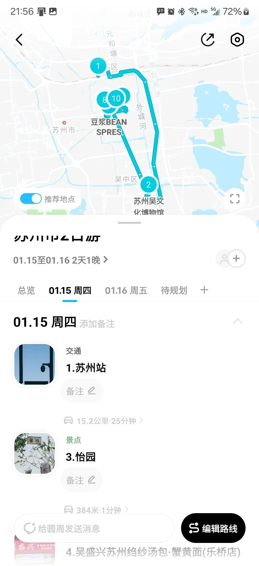 这次制定计划用了圆周旅迹,功能有点类似之前出国总用的wanderlog,可以分别排每天的行程,提供地图,自动计算相邻场所之间距离,可以直接调用地图来导航,调整顺序也方便;外加了ai功能,也可以让ai来操作一些懒得一点点调整的内容。