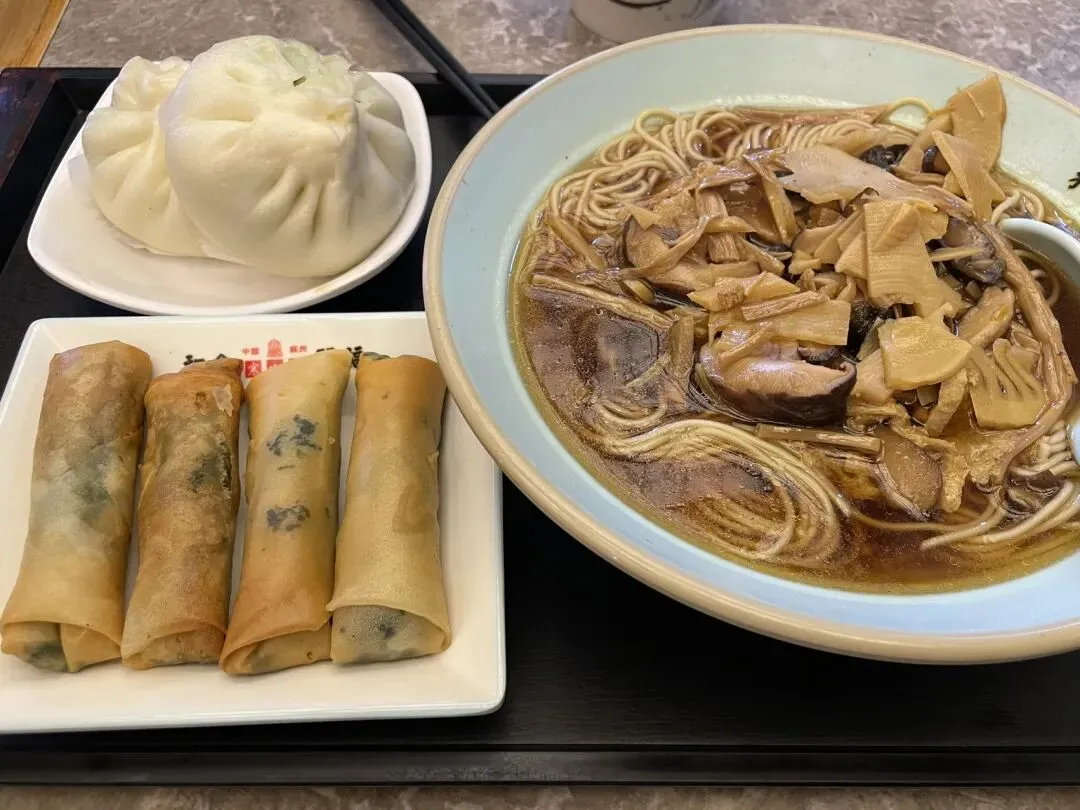 到寒山寺刚好也到了午饭时间,我们就先去寒山寺素斋馆吃饭。我们点了素面、素包和荠菜春卷。素面的浇头是甜口的,很典型的江浙沪口味。最好吃的是现炸的春卷,外皮酥脆,咬开是热乎乎的荠菜馅,原料简单却好吃。