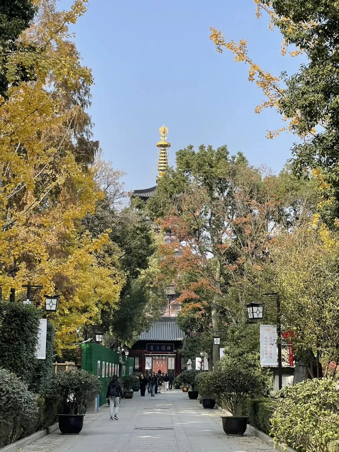 此行起点始于西园寺,还没走进寺庙,我就被寺庙门口金黄的银杏树吸引。金黄的树叶缀满枝头,衬着黄墙黛瓦的古寺,阳光穿过枝叶的缝隙,洒下斑驳的光影。举起相机随手一拍,都是自带滤镜的江南秋景。