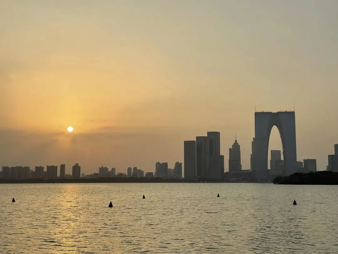 下午大约四点十五分,我们抵达金鸡湖,刚好赶上日落时分。沿湖边散步,看着橘红色的夕阳渐渐沉入湖面,湖面也被染成一片暖黄。不远处的东方之门,在夕阳的映照下,勾勒出独特的建筑线条。