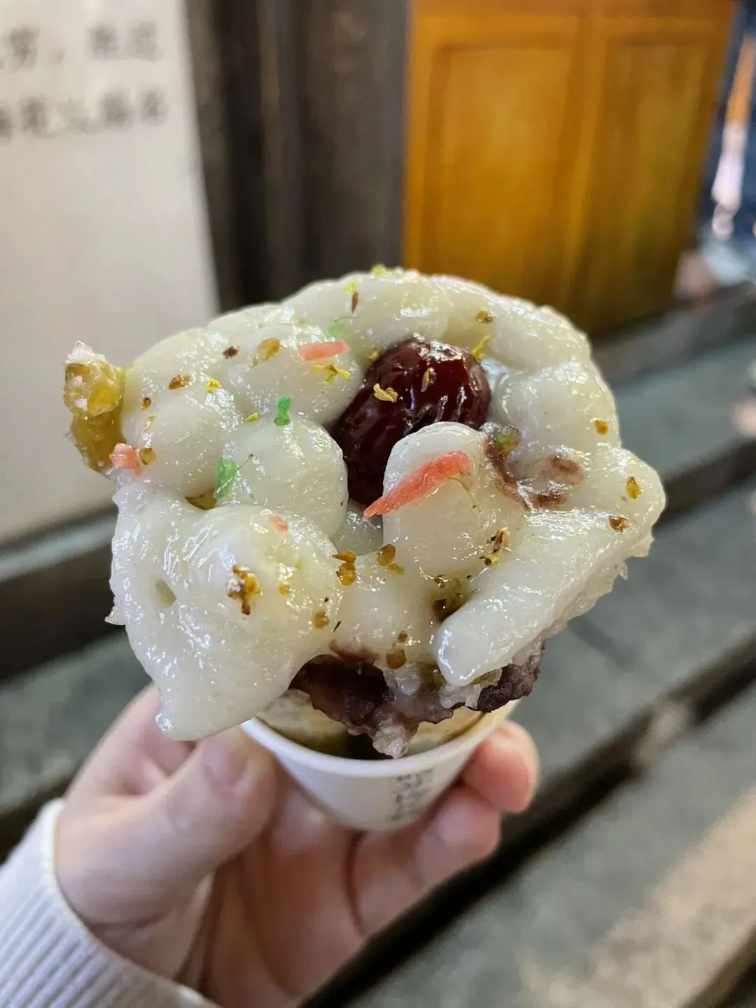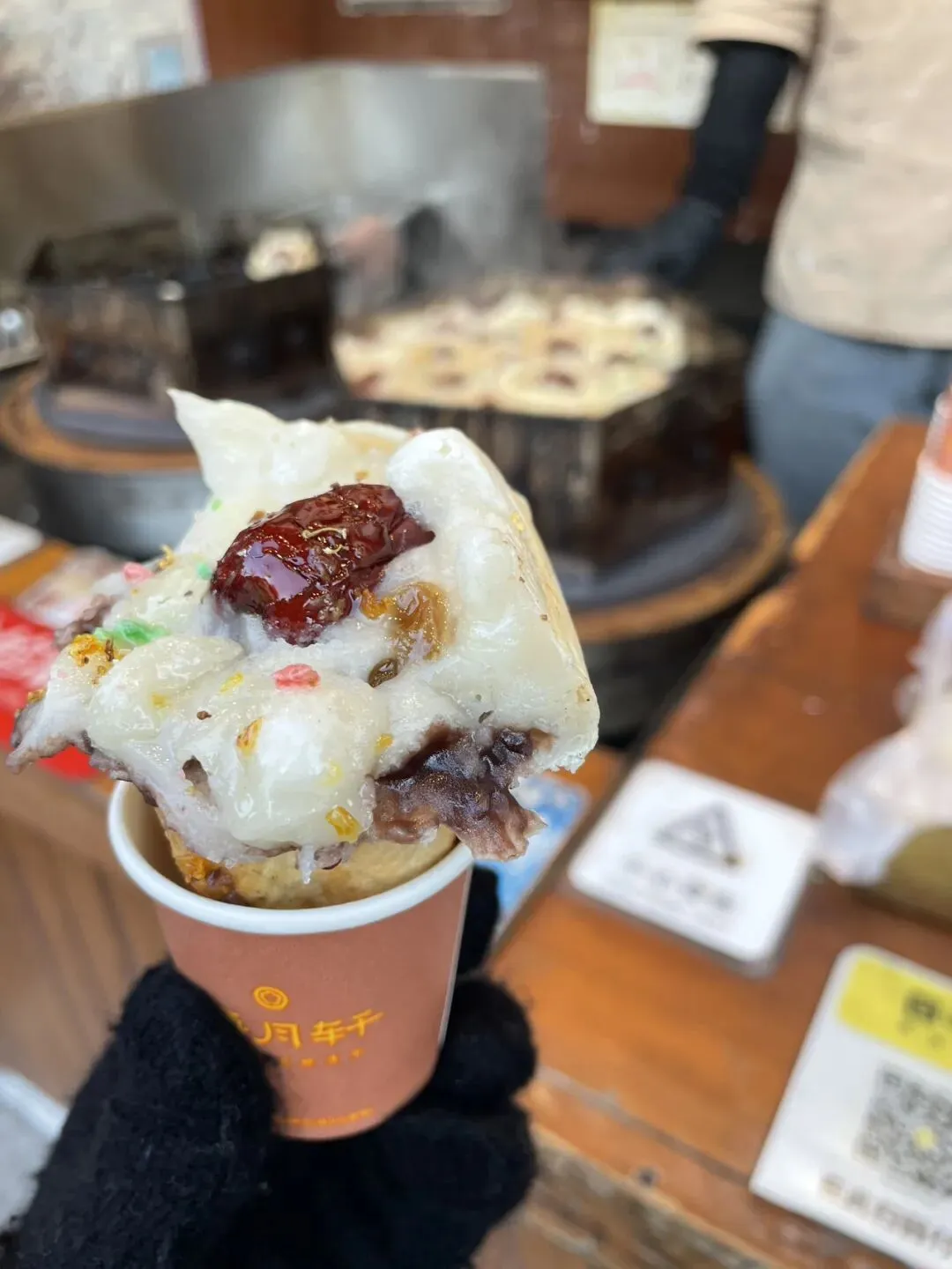 在这里,我第一次吃到了梅花糕,也是我认为此行吃到的最好吃的食物。梅花糕上面是糯米丸子和红枣压成的,咬下去里面是热乎乎的甜豆沙馅。