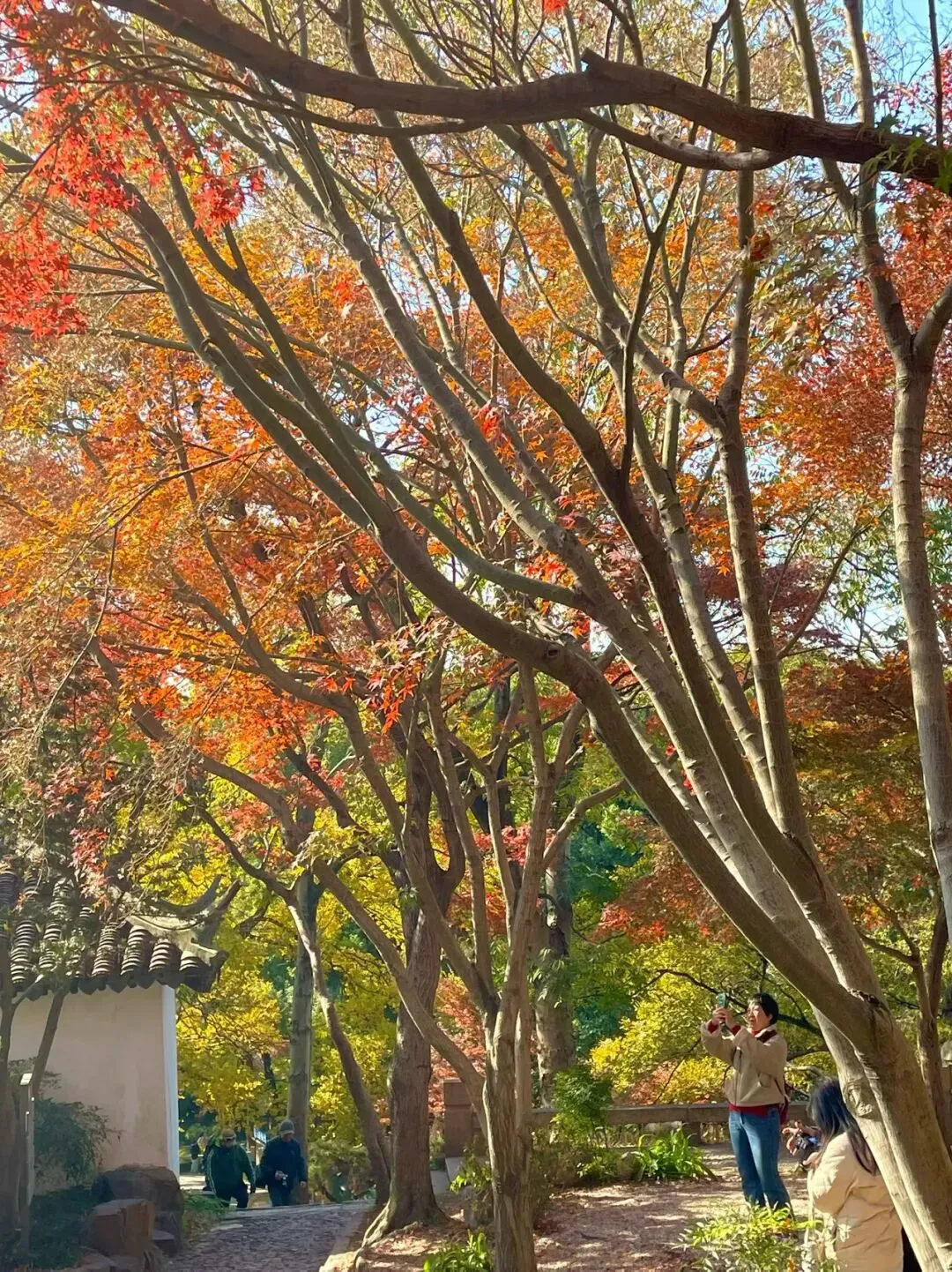 深秋的虎丘简直太美了,蓝天白云之下,满山草木被染成红黄绿三色,风一吹来时不时有落叶飘落,随手一拍都是一幅画。