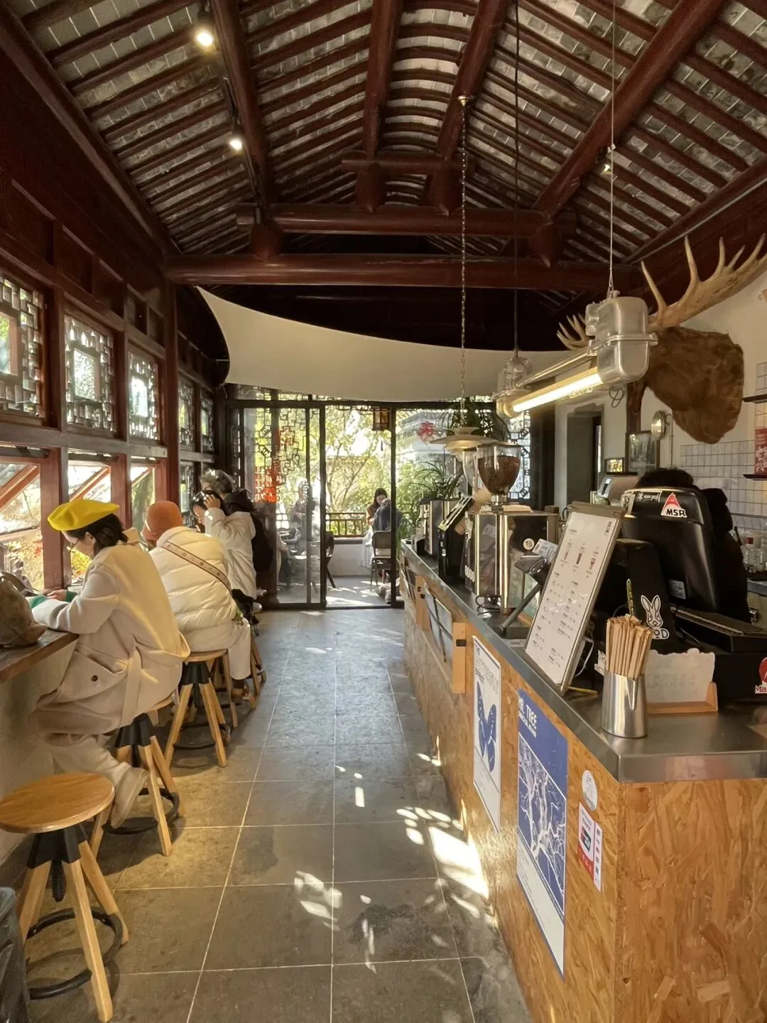 虎丘里还有一家叫三山船屋的咖啡店,店藏在树林间,装修简约,很适合点一杯咖啡坐在窗边晒太阳休息。我点了虎丘限定的招牌三花奶白,是加了茉莉、桂花、白玉兰的奶茶,奶味很浓,茶味清香。