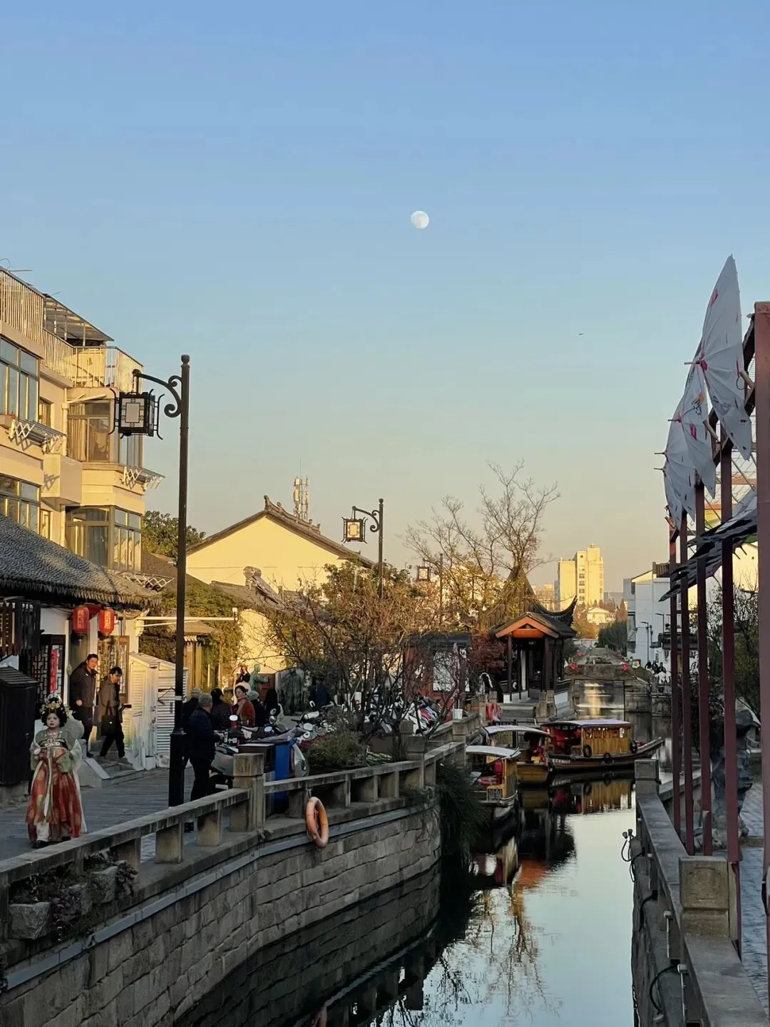 傍晚时分,我们到了平江路。相比于山塘街的热闹,平江路安静许多。河边老屋错落有致,临街的苏绣店摆满精致绣品。