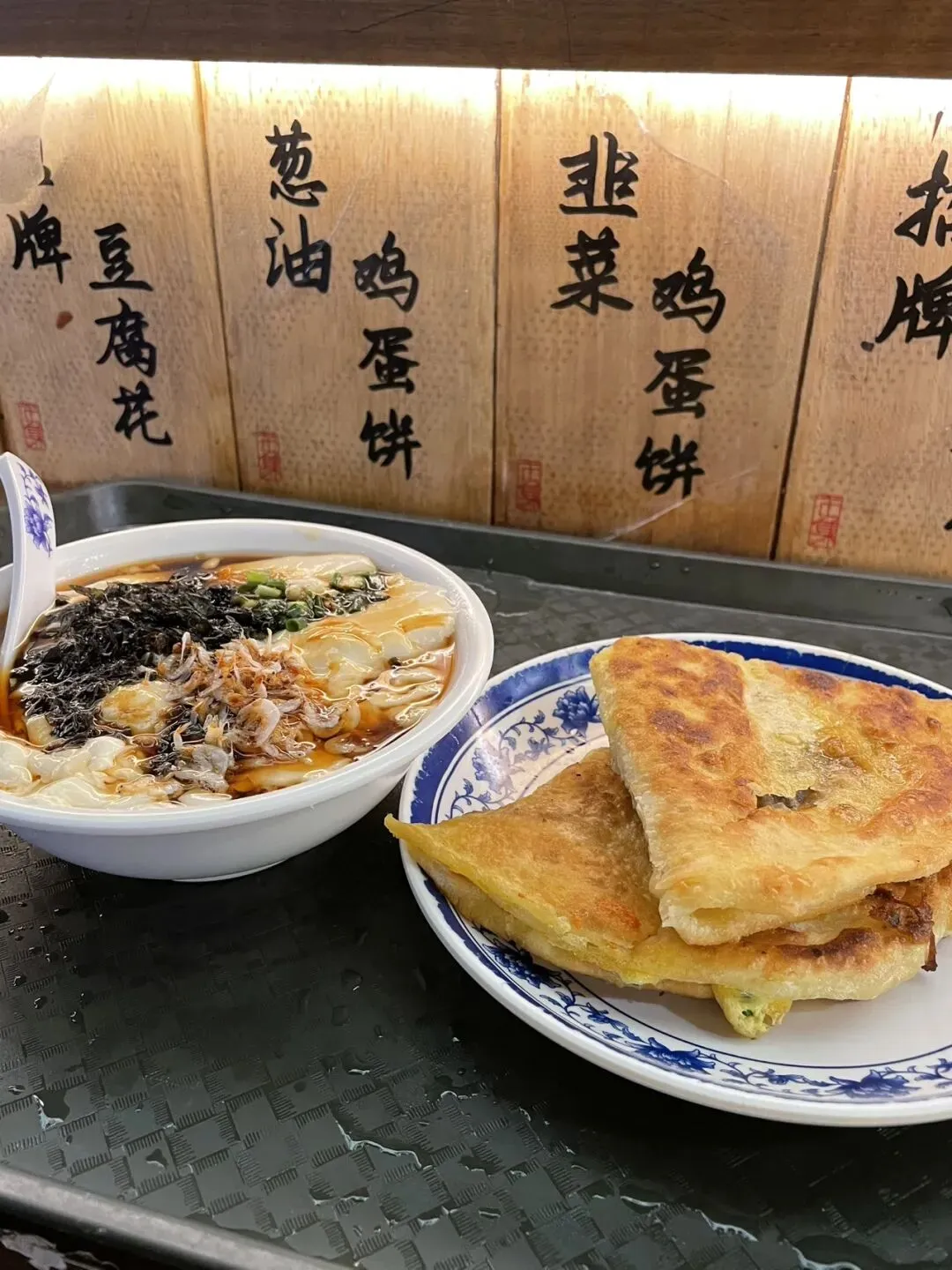 老客满蛋饼,用厚厚的油把蛋饼煎得香脆,咬下去咔嚓作响;咸豆花有点像鸡蛋羹的口感。