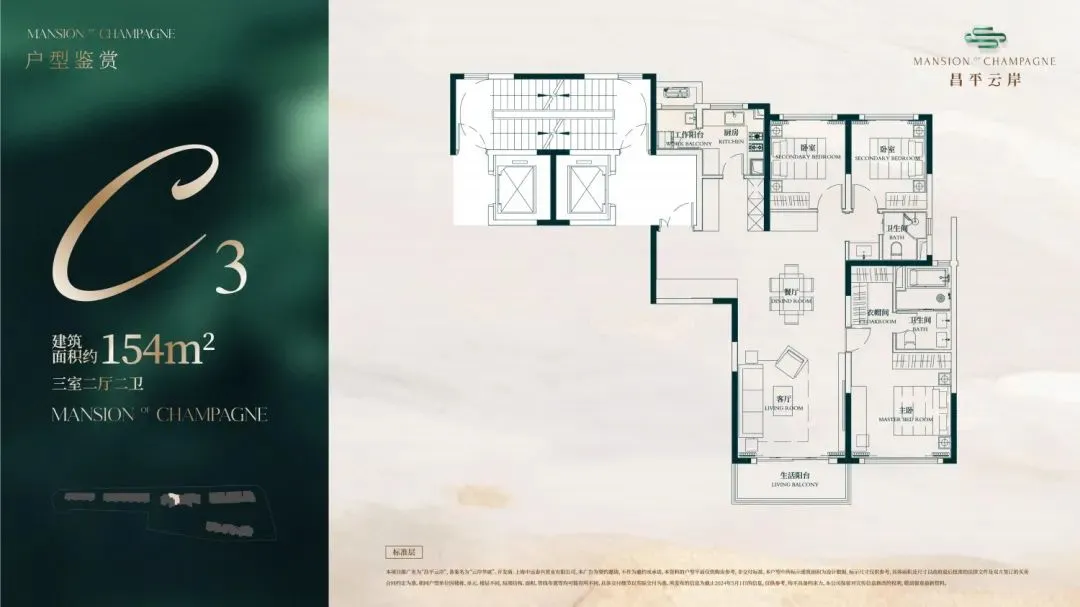 建面约154㎡3房2厅2卫户型▼