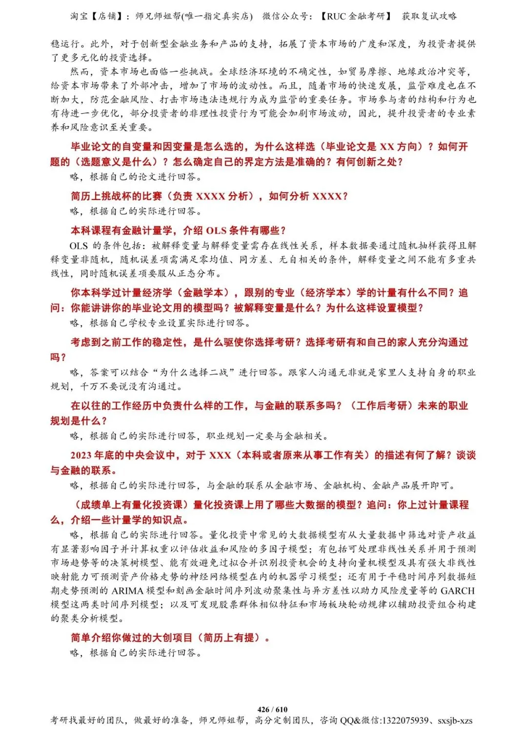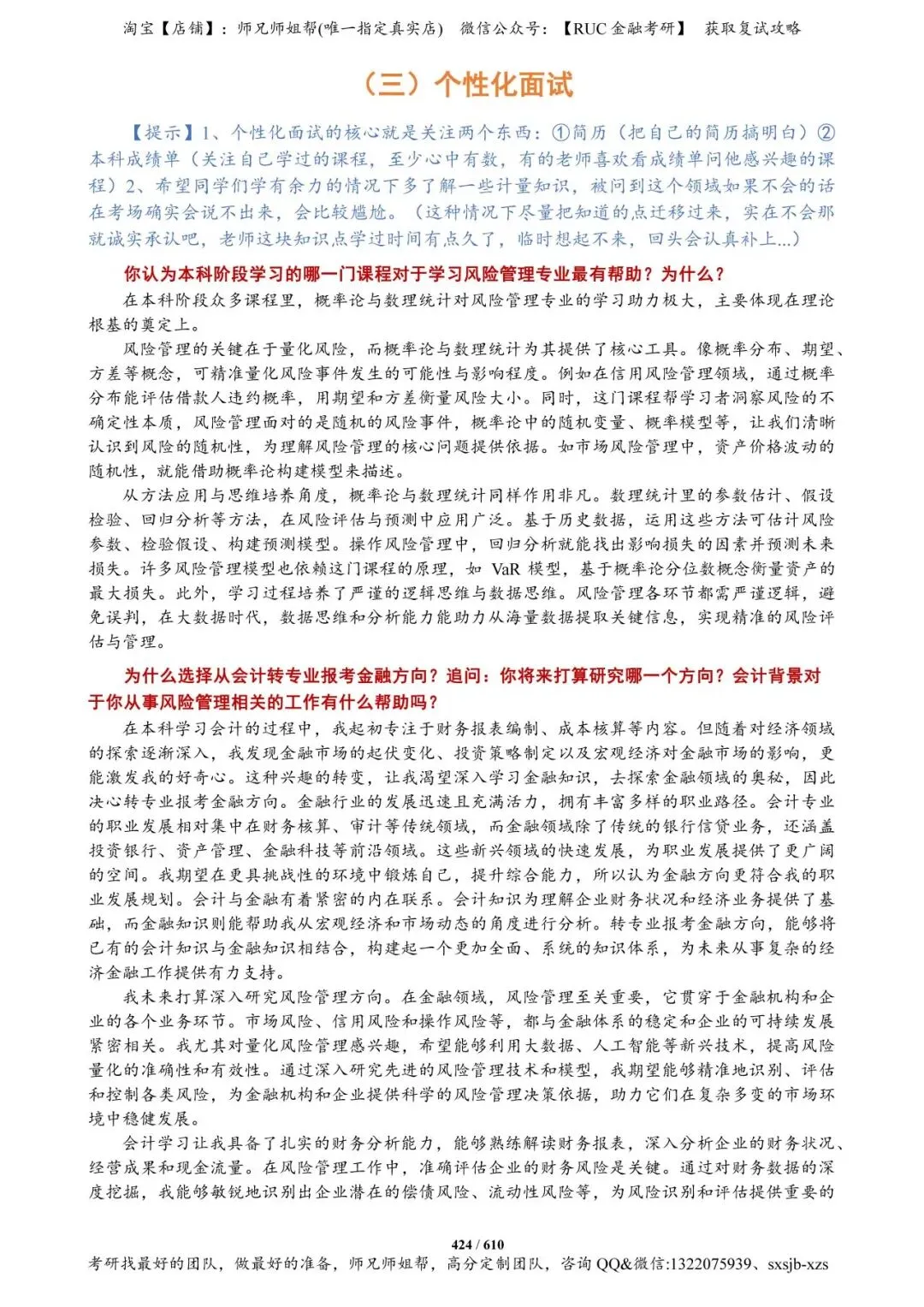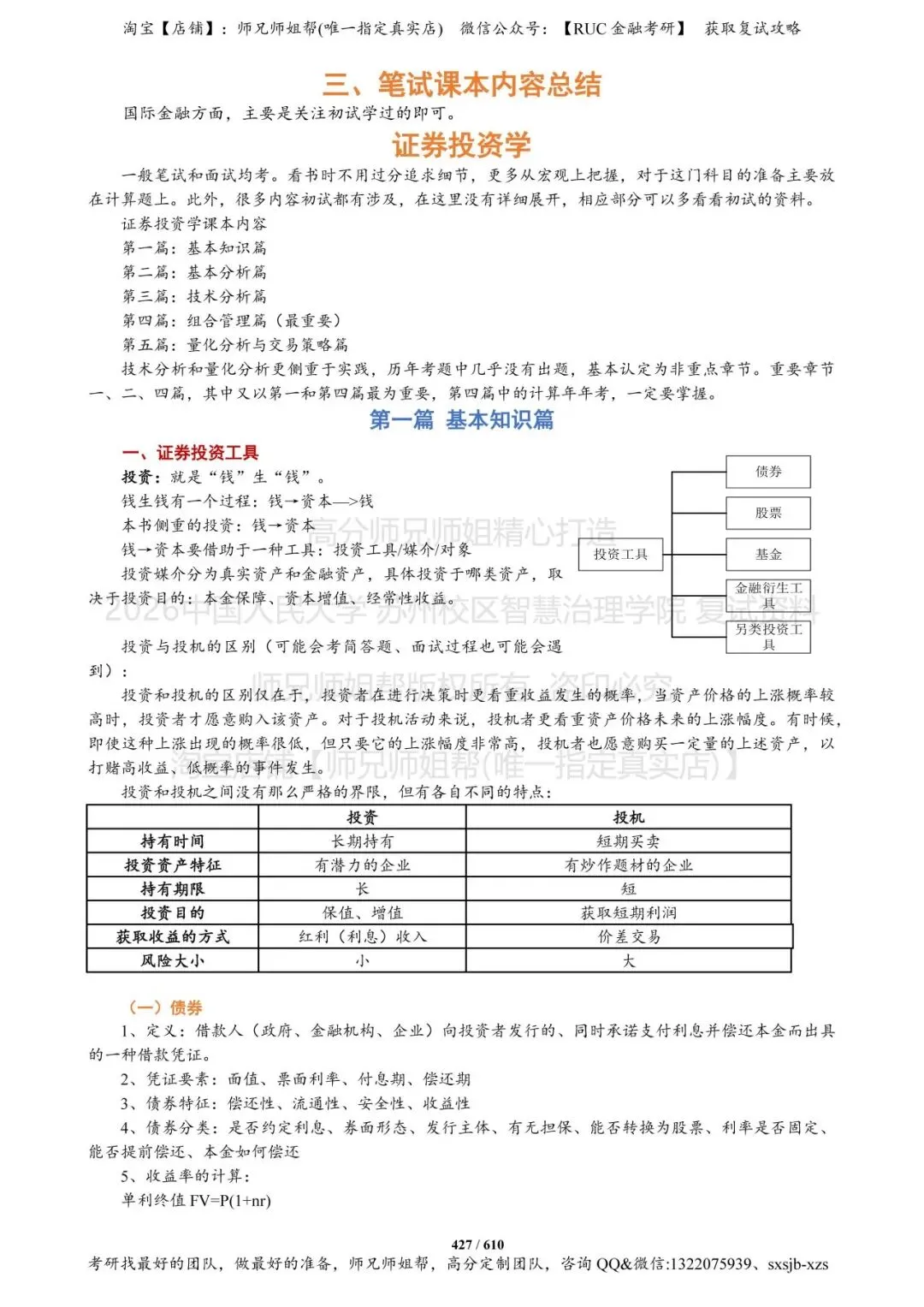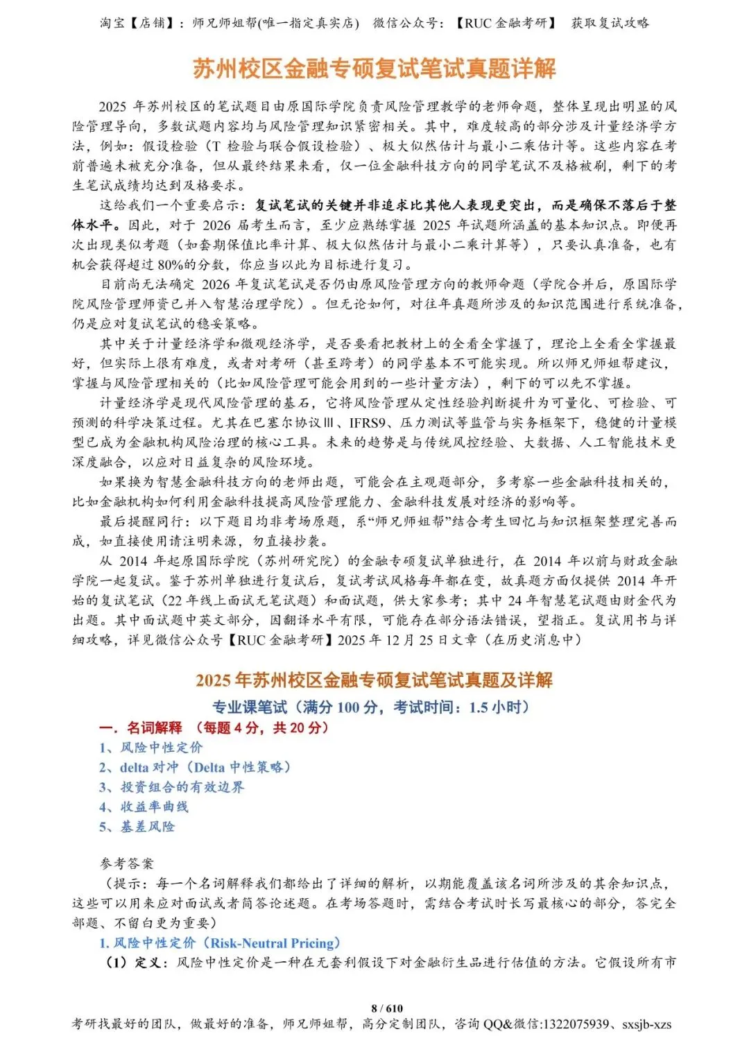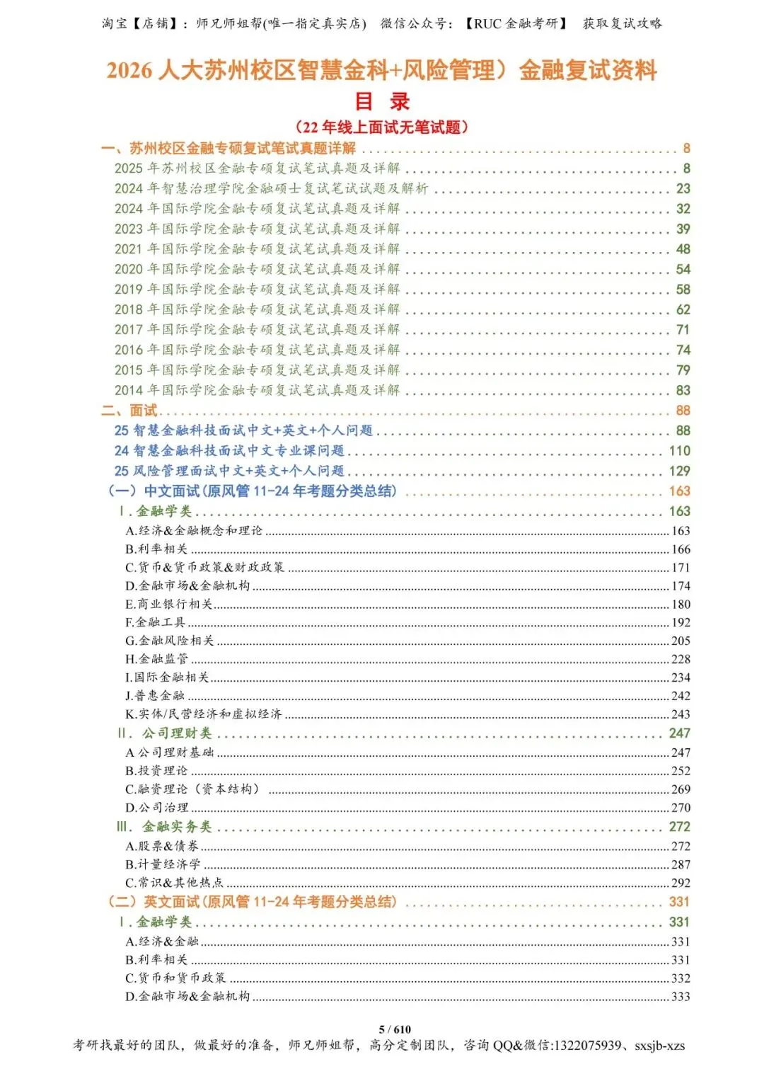 使用说明:26届苏州校区,统一由智慧治理学院招生,原国际学院风险管理招生名额和教师均合并,基于25届的情况,预计26届苏州校区笔试会使用同一套试卷,具体考察内容以证券投资学、商业银行、风险管理涉及的计量或衍生品简单计算为主;面试有可能分开进行,基础金融知识+金融科技相关/风险管理相关+个人素质(简历、本科学业成绩等相关)。26版的苏州校区复试资料内容构成: