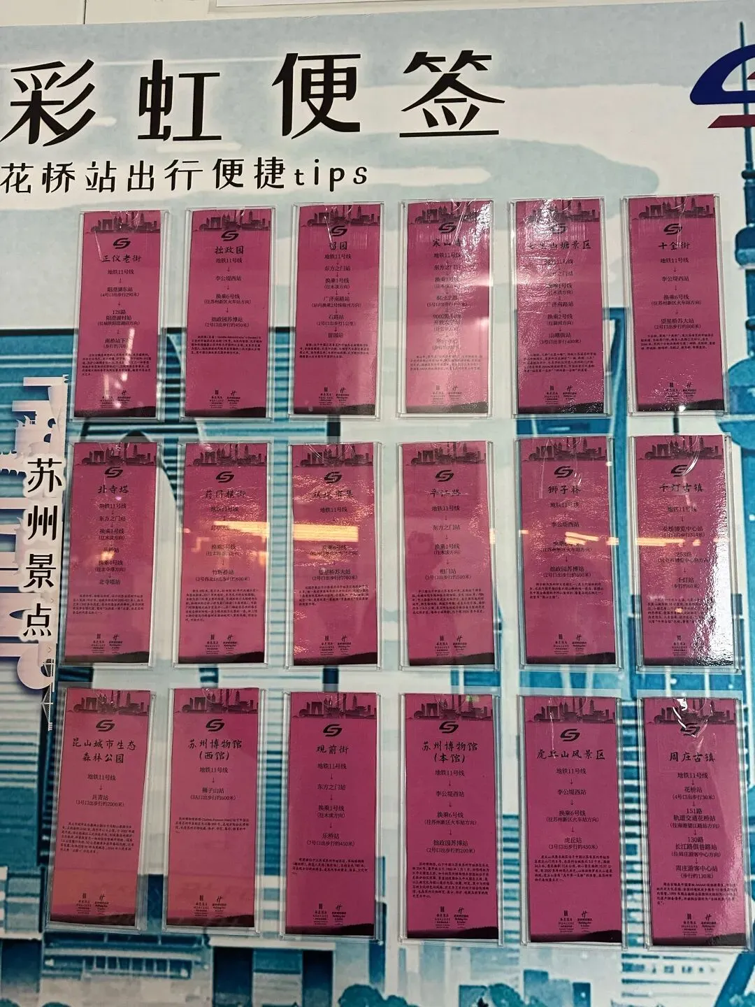 地铁站还有彩虹便签,写了前往苏州主要景点与上海主要景点的地铁与公交换乘方式。