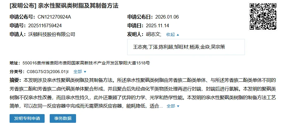 另外,除了上文提到的专利,沃顿科技于2024年就已开始在聚砜领域进行专利布局,覆盖从改性技术到树脂制备等关键环节: