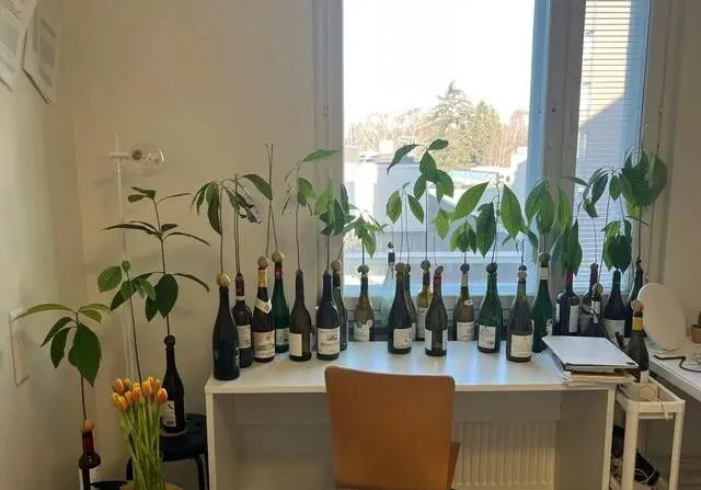 酒瓶里残余的葡萄酒 , 能给牛油果提供养分 , 细长的瓶身呢 , 刚好让根系往下扎 , 长得直溜溜的。