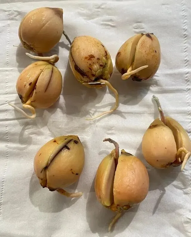 把果核用湿纸巾裹起来 , 装进密封袋或者盒子里 , 放阴凉的地方 , 保持湿润。 大概三周左右 , 顶端就会裂开 , 冒出白色的根。