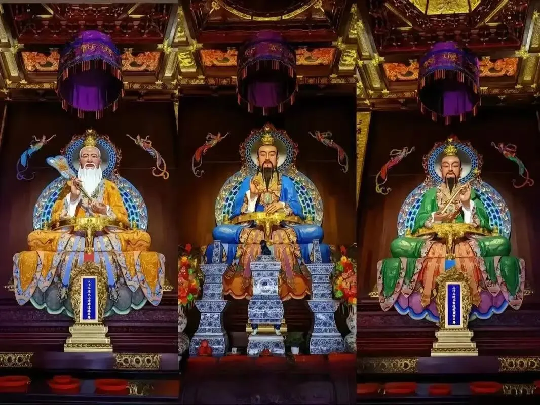 三清大殿内的三位道教最高神仙,即玉清元始天尊、上清灵宝天尊、太清道德天尊。其中太清道德天尊为国人最熟悉,即我们在电视《西游记》里看到的太上老君。他那八卦炉里炼的仙丹全被孙猴子偷吃了,据说吃一粒,就可多活800年。