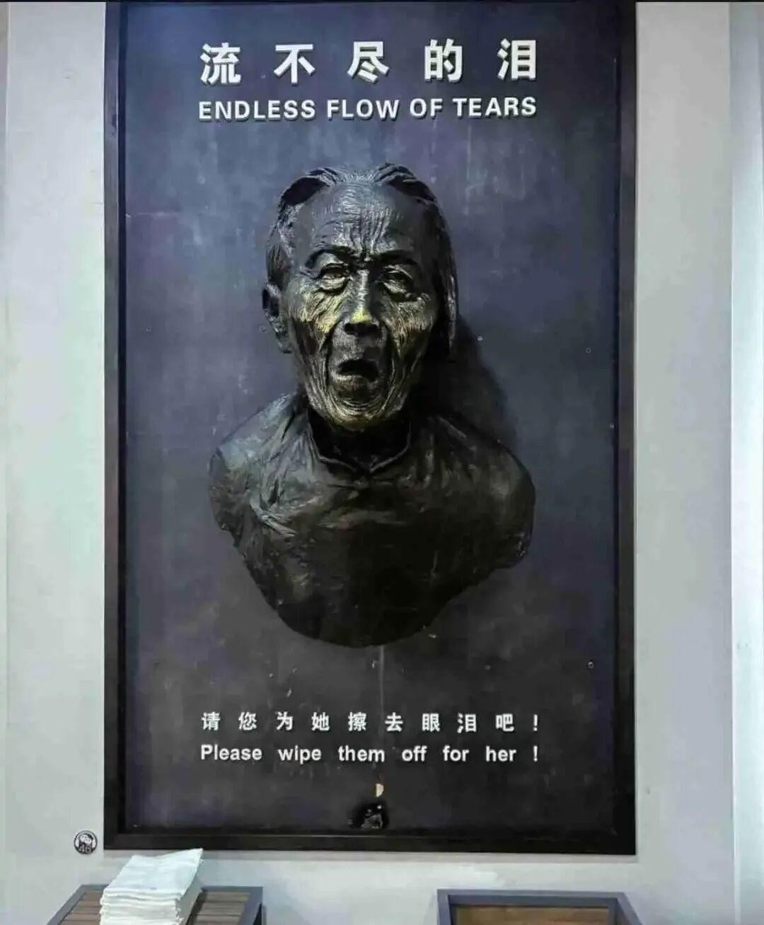 如今走进利济巷陈列馆,空气里都弥漫着“泪”的重量——这不是刻意营造的氛围,而是无数受害者用血泪凝结的伤痛。“泪洒一面墙”上,一张张黑白照片静静凝望,她们的名字大多无从考证,只剩空洞的眼神,诉说着未被言说的苦难;“泪湿一片地”复原了当年的狭窄隔间、陡峭楼梯,榻榻米上的褶皱里,仿佛还残留着受害者颤抖的体温;“流不尽的泪”展厅中,以朴永心被解救时的模样为原型打造的女性浮雕,眼部不断滴落水珠,观众伸手擦拭的瞬间,指尖触到的,是跨越数十年仍未愈合的伤疤。