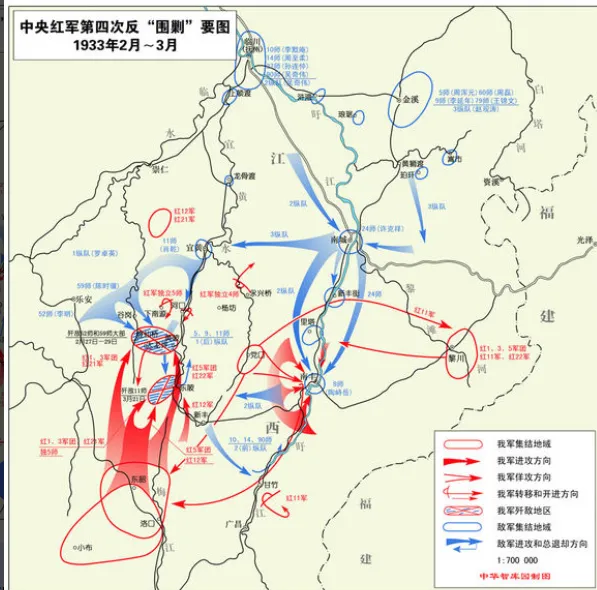 中央苏区的第四次反围剿战争,是由中共方面的朱德、周恩来指挥的,他们一改毛式游击战术,采取大兵团伏击的“运动战”战法,利用在苏区内部情报和地理的优势,对采用分进合击战术的轻敌冒进的国军精锐陈诚第十八军十一师予以重创【1】,在粉碎这次围剿之际,也带给国军一方以很大震撼。