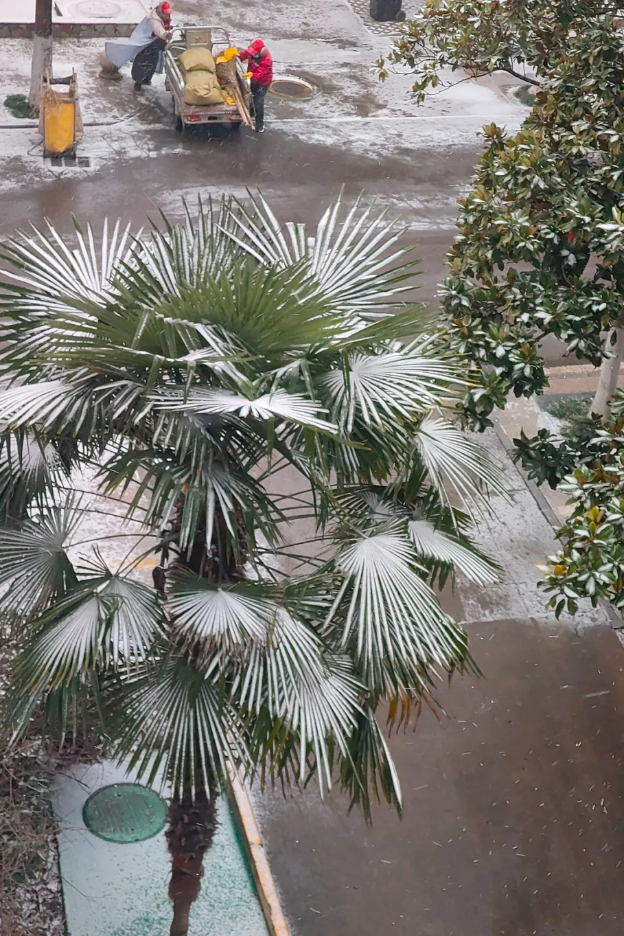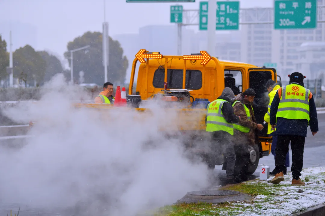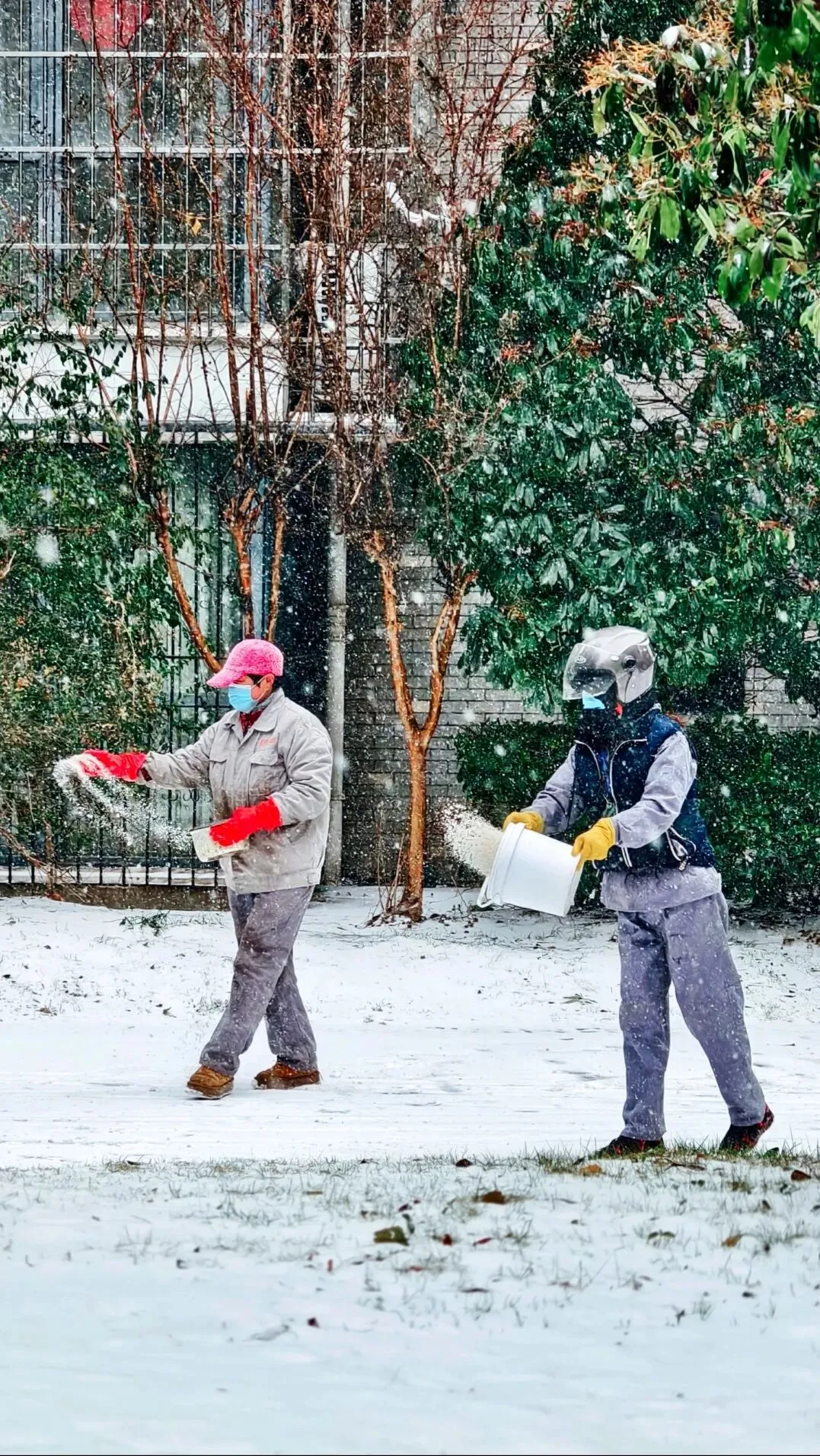他们手中的铁锹和融雪剂