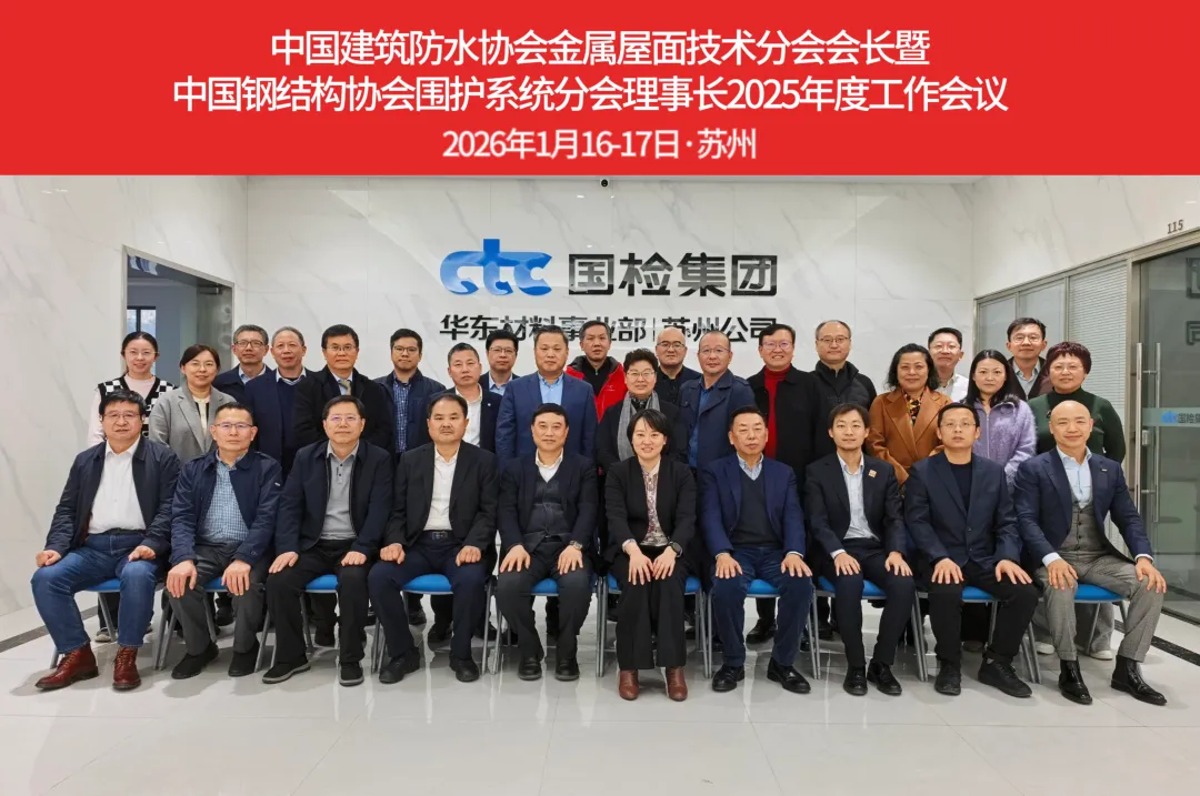 2025 年度中国建筑防水协会金属屋面技术分会会长工作会议于 2026年1月16-17日在江苏苏州召开。16日下午分会20位会长和代表、特邀嘉宾,以及分会秘书处成员出席会议。本次会议由中国建材检验认证集团苏州有限公司承办。会议由分会秘书长蔡昭昀主持。工作会议总结了2025年分会各项工作情况,深入讨论了2026年分会工作重点和工作计划。会议强调了技术创新和标准修订对提升行业整体技术水平的重要性,同时指出了加强行业自律和市场展望的必要性。面对国际竞争,行业内企业需加强合作,共享资源,互补优势。