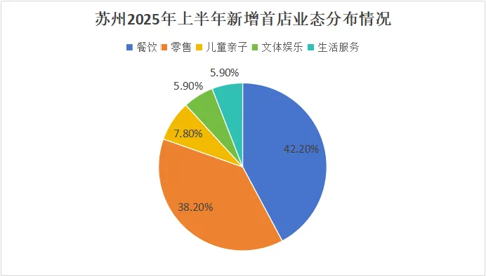 2025年,苏州首店经济保持“规模扩容、结构优化、特色凸显”的发展态势。上半年新增首店102家,包括全国首店5家、华东首店2家、江苏首店21家和苏州首店74家,累计总量达1083家。较2024年同期的76家增长超过34%,不仅创下历史新高,在品牌质量与门店层级上也实现了显著跃升。这表明苏州的首店正持续向“高能级”发展,印证了其在全国商业版图中地位的攀升。业态分布如图1所示,主要集中于餐饮以及零售行业。国际品牌加速布局,苏州中心商场引进27家高能级首店,LE LABO等品牌推动营业额显著提升;平价超市巨头奥乐齐(ALDI)昆山首店开业当日,客流突破10万人次,单日销售额高达110万元;商业载体呈现互补格局,比斯特苏州购物村启动三期扩建,计划新增50家精品店;仁恒仓街则强化“首店+非遗”文化融合模式。同时,江苏省于2025年5月出台文件,提出“对各地支持引进亚洲及以上级别首店的予以奖励激励”,对大型首发活动实行“一次性申请、一次性许可”,审批周期从7天压缩至5天。显著提高首店开业及相关活动的审批效率,加速项目落地。