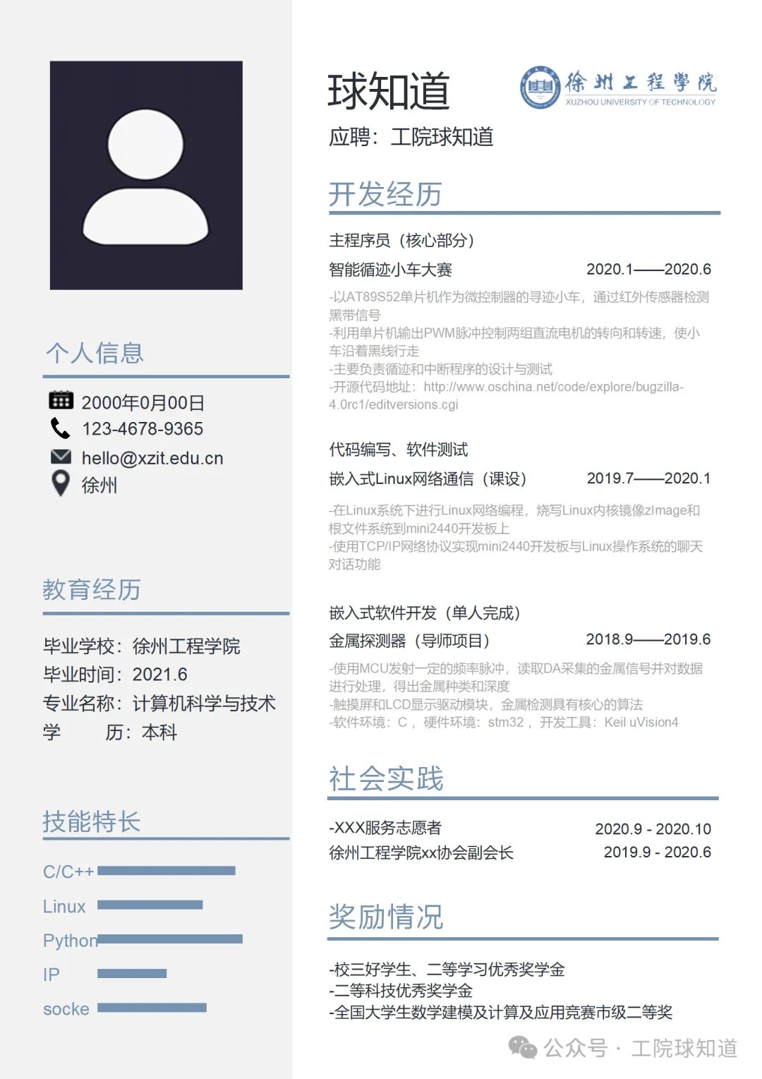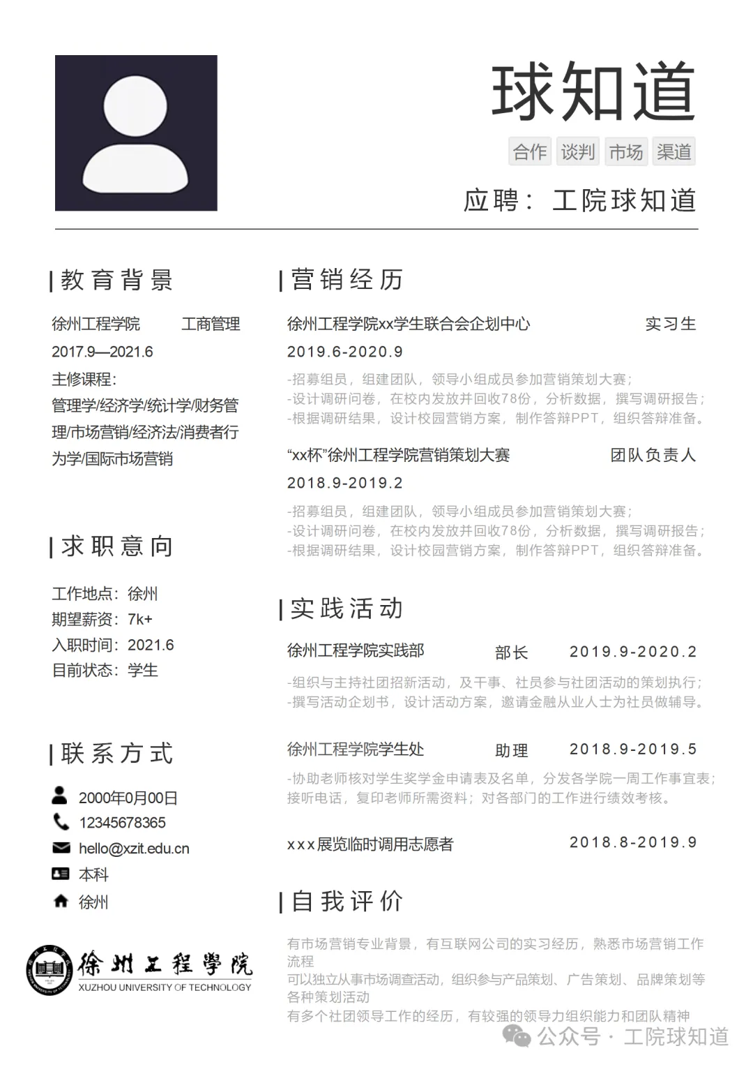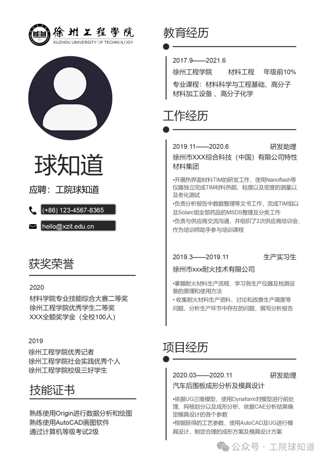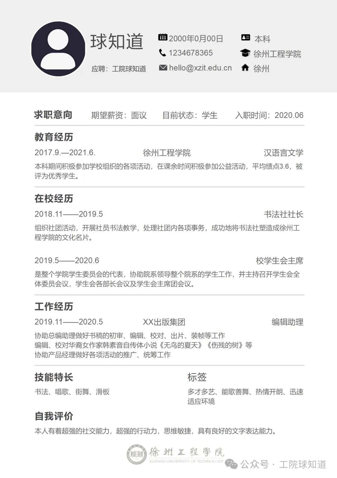 获取方式: 点击下方名片 关注【工院球知道】 后台回复: 简历