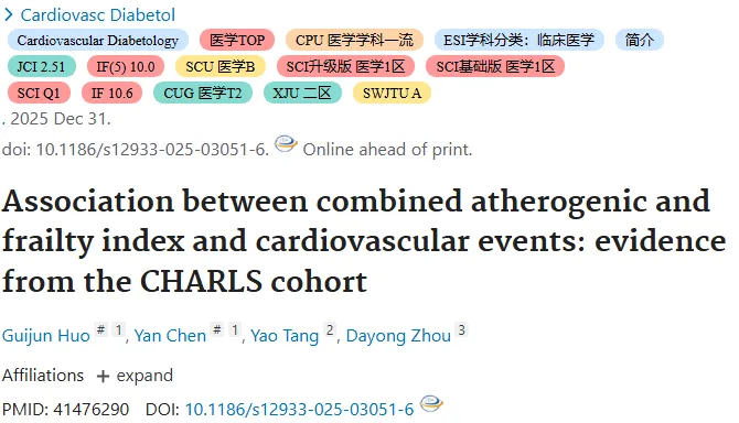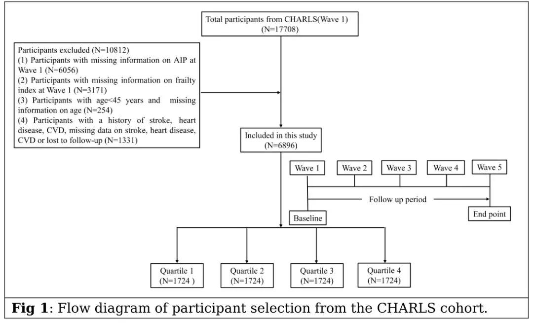 3. 参与者筛选流程:从CHARLS基线17708人中,排除缺失数据、基线有心血管疾病、年龄<45岁等10812人,最终纳入6896人(图1)。