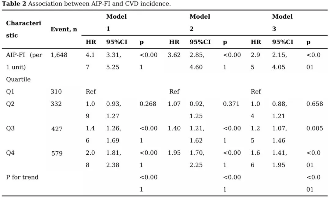 3. 按AIP-FI四分位数分组,Q3(HR=1.25,95%CI:1.07~1.46)和Q4(HR=1.66,95%CI:1.41~1.95)组CVD风险显著高于Q1(参考组),Q2组无显著差异(表2);