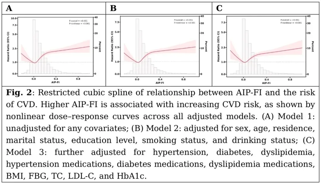 4. 限制性立方样条分析显示,AIP-FI与CVD风险呈显著正非线性关系(所有模型P-overall<0.05,P for non-linear<0.05)(图2)。