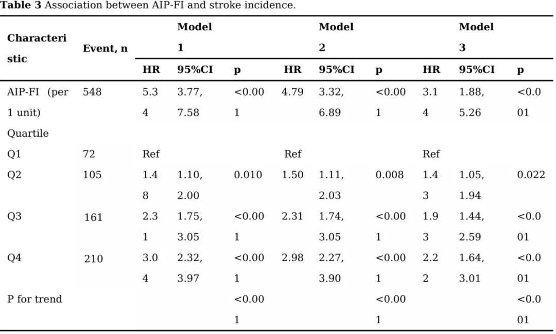 2. 调整所有混杂因素后,AIP-FI每升高1单位,中风风险增加214%(HR=3.14,95%CI:1.88~5.26,P<0.001)(表3);