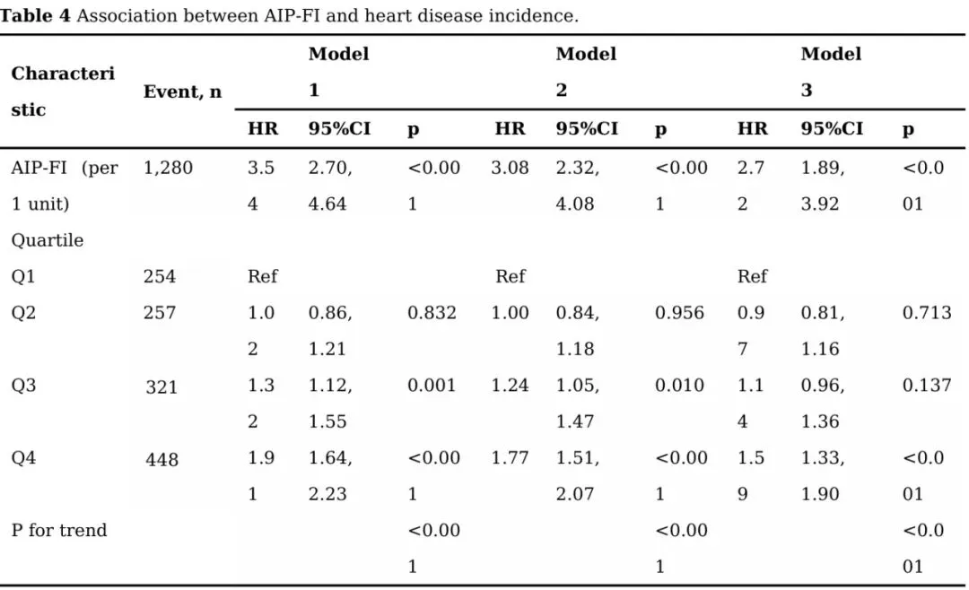 2. 调整所有混杂因素后,AIP-FI每升高1单位,心脏病风险增加172%(HR=2.72,95%CI:1.89~3.92,P<0.001)(表4);
