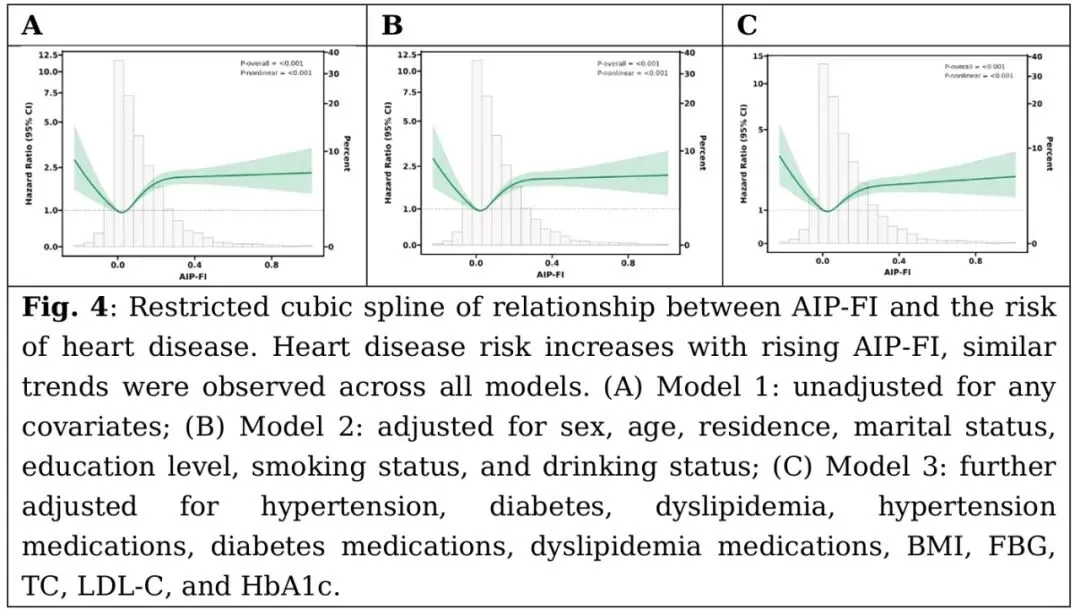 4. 限制性立方样条分析显示,AIP-FI与心脏病风险呈显著正非线性关系(所有模型P-overall<0.05,P for non-linear<0.05)(图4)。