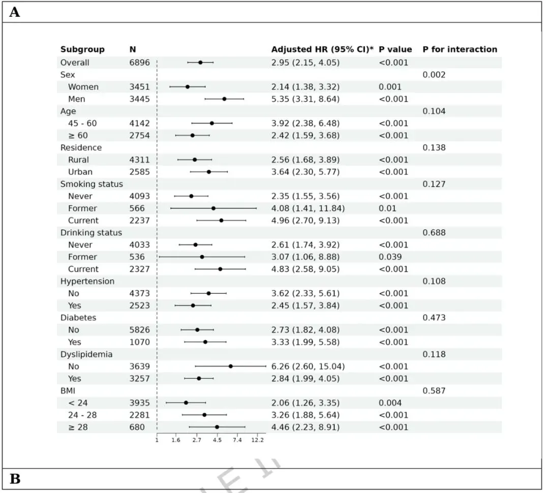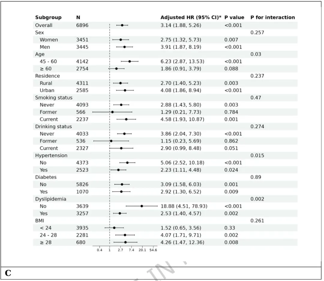 1. AIP-FI与CVD、中风、心脏病的关联在多数亚组(年龄、居住地、吸烟/饮酒状态、基础疾病、BMI等)中保持一致(图5A、B、C);