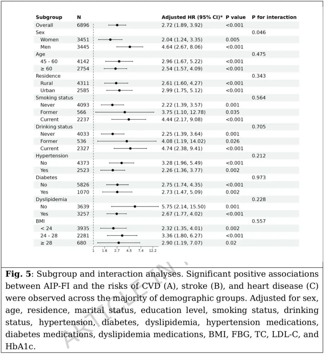 图5:AIP-FI与CVD、中风、心脏病的亚组及交互作用分析图