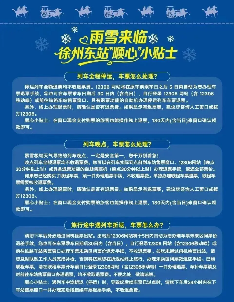 凡购买相关停运列车车票的旅客,可自列车停运信息公布时起至车票乘车日期后30日以内在12306网站(含手机App)办理退票手续,或持购票时所使用的有效身份证件原件到车站退票(已打印报销凭证的请将凭证交予车站窗口工作人员),以上均不收取退票费。