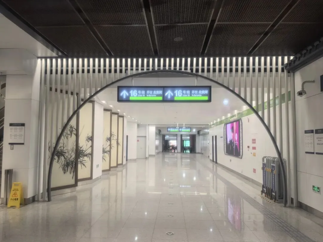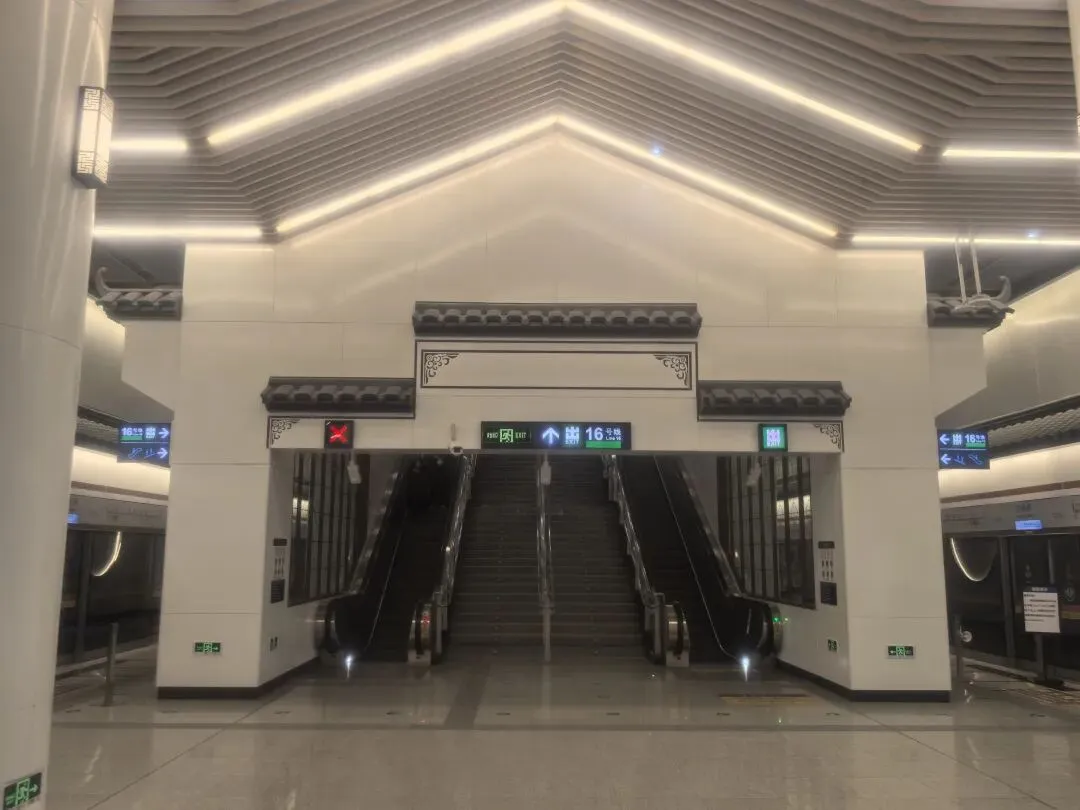 同时,16号线站台本身的设计也提升了体验的完整性。其站台长度近200米,比许多早期线路的站台更为宽敞 。并且,16号线各站均设置了上下双向扶梯,这意味着您到达16号线站台后,无需再寻找额外的楼梯或其他设施返回站厅,动线设计清晰直观。