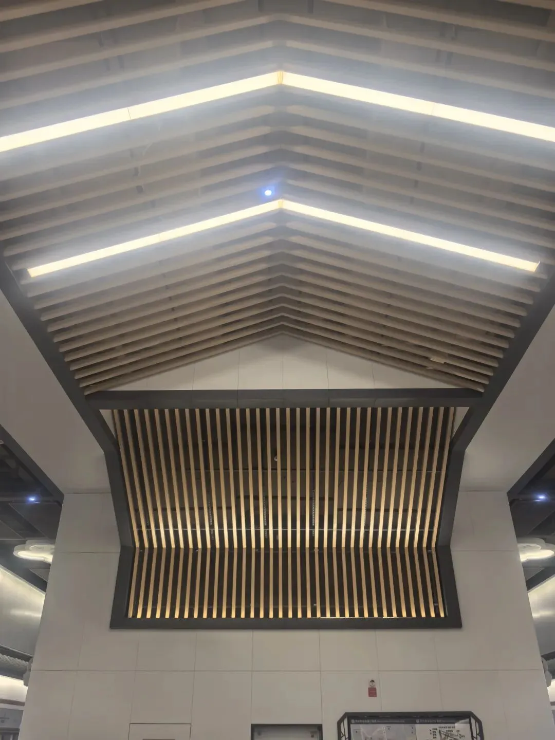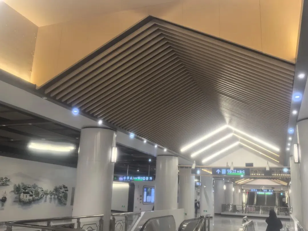 尤为值得一提的是,12号线苏州桥站的站厅层高显著高于标准车站,结构高度达25.73米。这一设计不仅满足了作为换乘站的复杂功能需求,也为装饰艺术提供了更充分的展示空间。高阔的空间使大型水墨壁画得以从容展开,避免了压抑感;同时,设计师能够运用更多垂直元素(如屏风式隔断、檐角造型灯饰),在天花板与墙面之间构建丰富的光影层次,仿若苏州园林中的廊道与窗景,让乘客在行进中感受“移步换景”的趣味。较高的层高还允许设置更具气势的仿古屋檐装饰和宽敞的木质格栅吊顶,强化了空间的通透性与艺术表现力,使乘客仿佛穿行于一座现代地下园林。