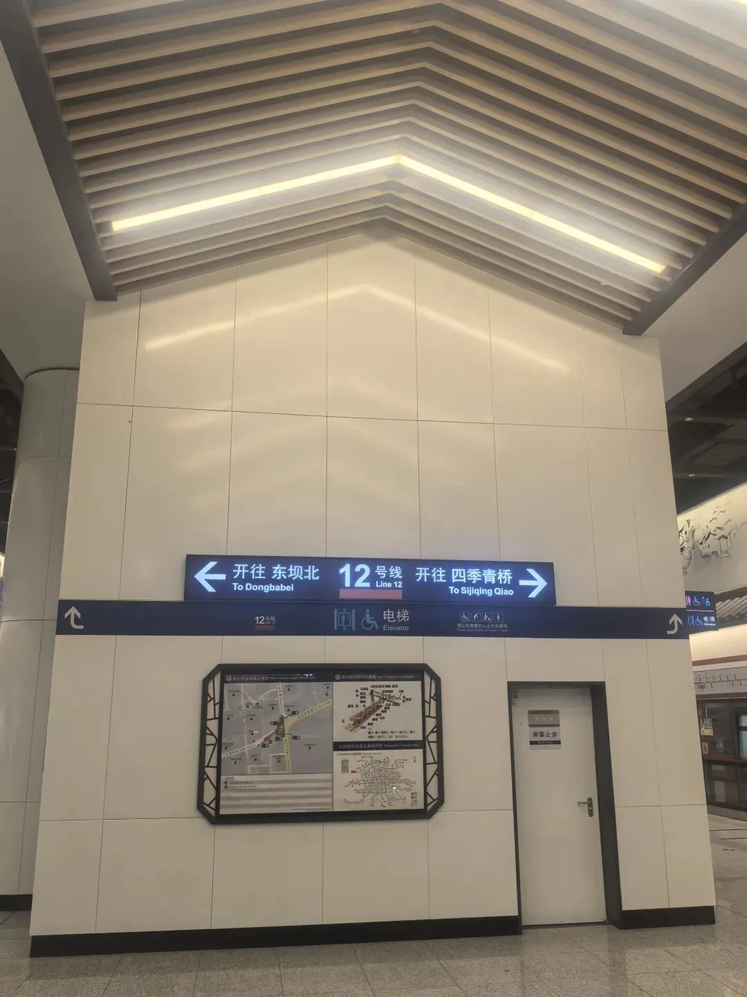 相较于16号线的特殊结构,12号线站层则采用更为常规的地下三层岛式站台设计。地下一层为设备层,地下二层为站厅层,地下三层为设有一座岛式站台的站台层。乘客可以在岛式站台两侧等候前往四季青桥或东坝北方向的列车。