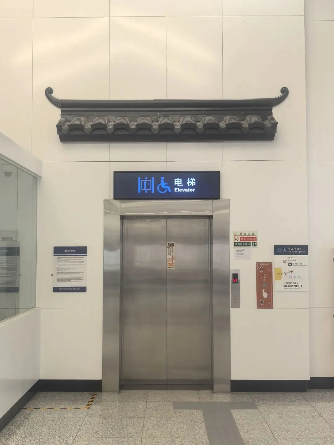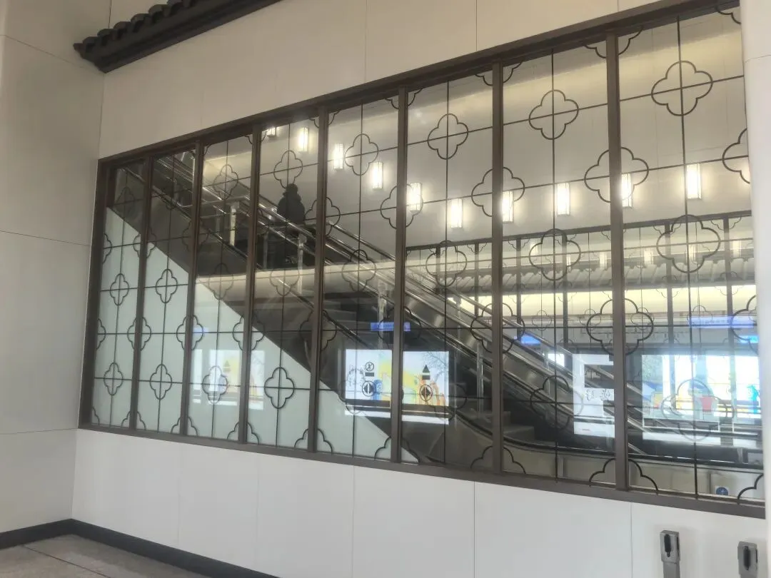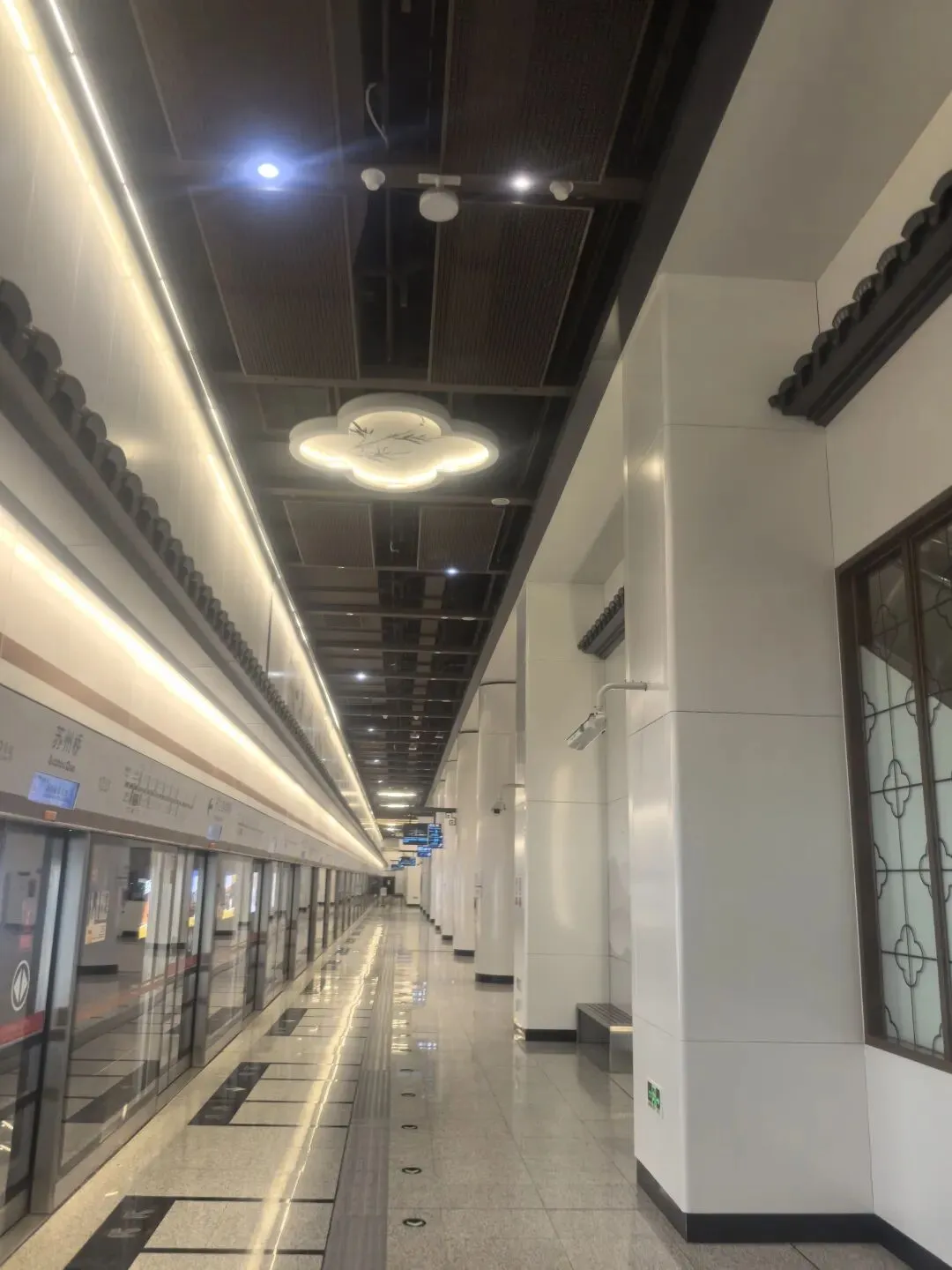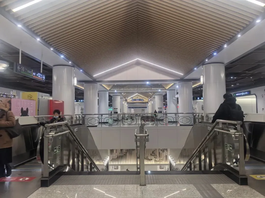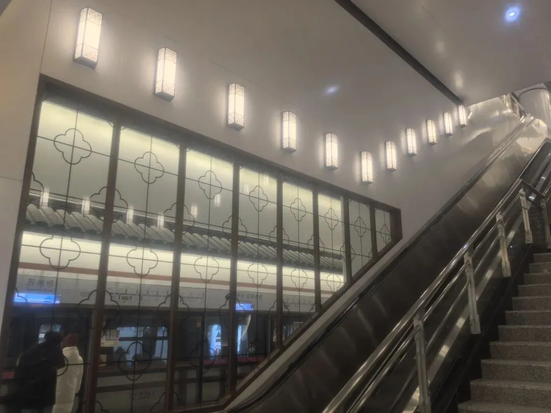 仿古屋檐与屏风:站内设计的仿古屋檐和屏风式隔断,既再现了苏州园林的意境,又自然划分了不同功能区域,如换乘通道与等候区。地面和墙面的材质变化不仅呼应设计主题,同时通过触感差异为视障人士提供导向辅助。