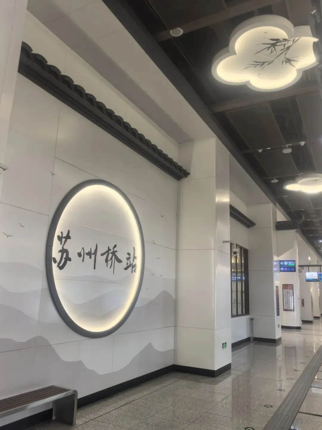 苏州桥站的装饰设计远不止于美观,更融入了实用功能考量。车站装修汲取江南园林的设计手法,将传统园林建筑中屋脊、窗花等几何造型元素巧妙转化为空间导向标识。高低起伏、错落有致的空间布局不仅营造出苏州园林般的意境,同时也自然引导乘客流线,避免客流拥堵。
