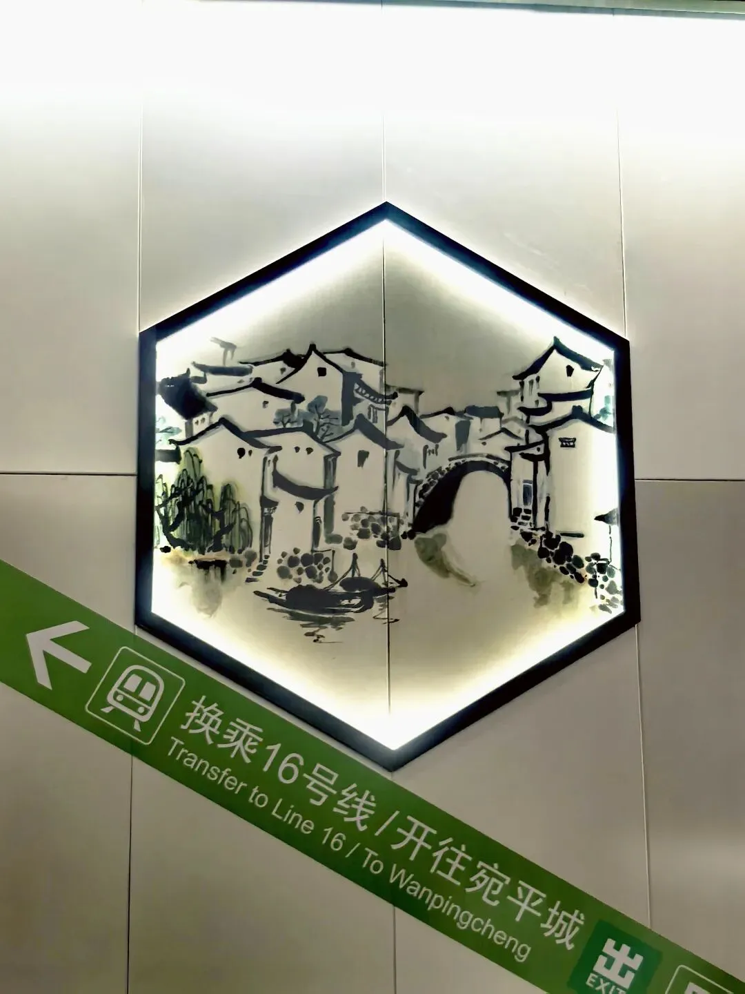 北京地铁12号线苏州桥站以其独特的“江南水乡”主题装饰和卓越的空间设计,成为北京地铁网络中一个突出的文化地标。苏州桥站的装饰特色深度融合了苏州园林与水乡文化元素。车站设计汲取江南园林手法,将传统建筑中的屋脊、窗花等几何造型融入其中,形成高低起伏、错落有致的空间层次感。站厅内装饰着大幅中国传统水墨壁画,描绘了小桥流水、白墙黛瓦、乌篷船等经典江南景致,营造出“烟雨江南”的诗意氛围。此外,天花板采用仿江南传统坡形屋顶的木质格栅设计,在灯光映衬下显得温暖明亮;墙面装饰有灰白瓦片构成的江南马头墙元素,配合印着窗花的大片透明玻璃和花瓣状吸顶灯,进一步强化了灵秀温润的视觉体验。