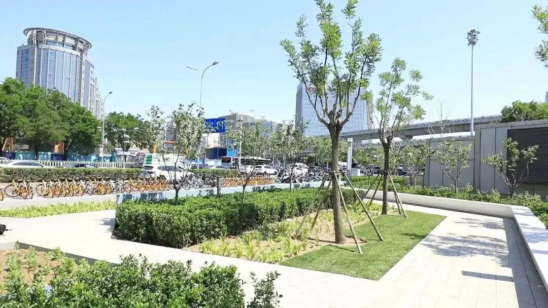 出入口融合设计:车站A口采用一体化下沉广场式设计,配备喷水池和长椅,巧妙地将地铁出入口融入城市公共空间。