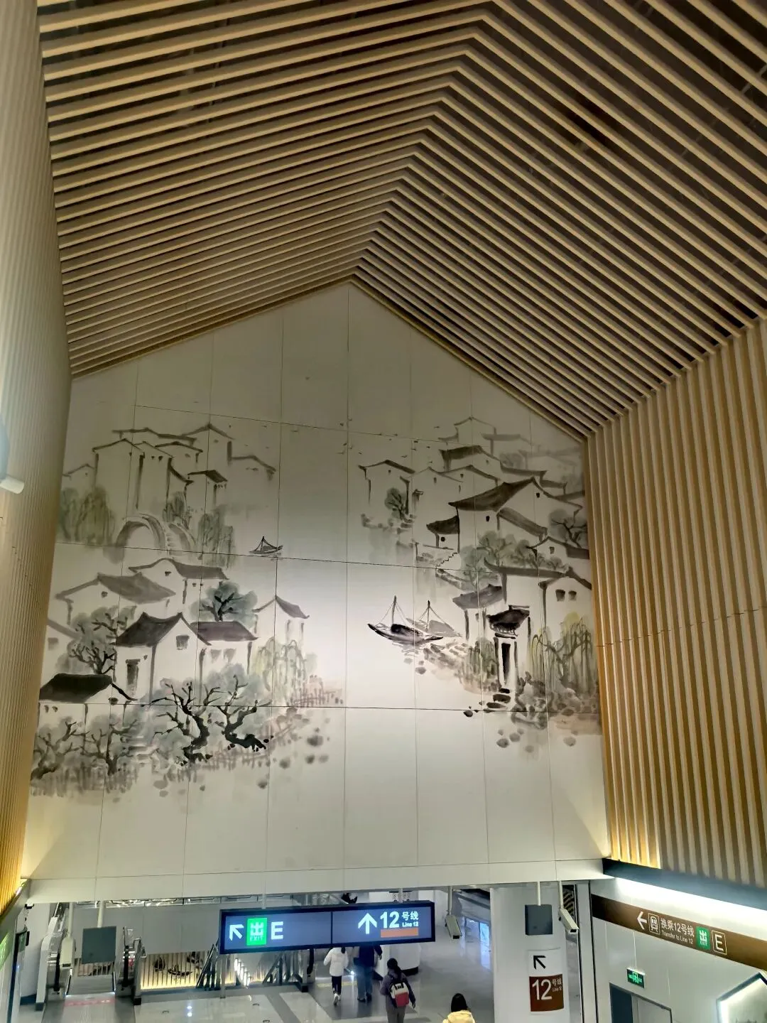 高大的空间允许设计者设置高侧窗和精心布局的照明系统,投射出类似竹林或窗棂的光影效果,这些光影不仅营造氛围,也充当着方向指引的自然标识。站厅内《水乡印象》等大幅水墨壁画不仅展现江南风光,其构图和色彩变化还帮助乘客定位,减轻地下空间的压抑感。