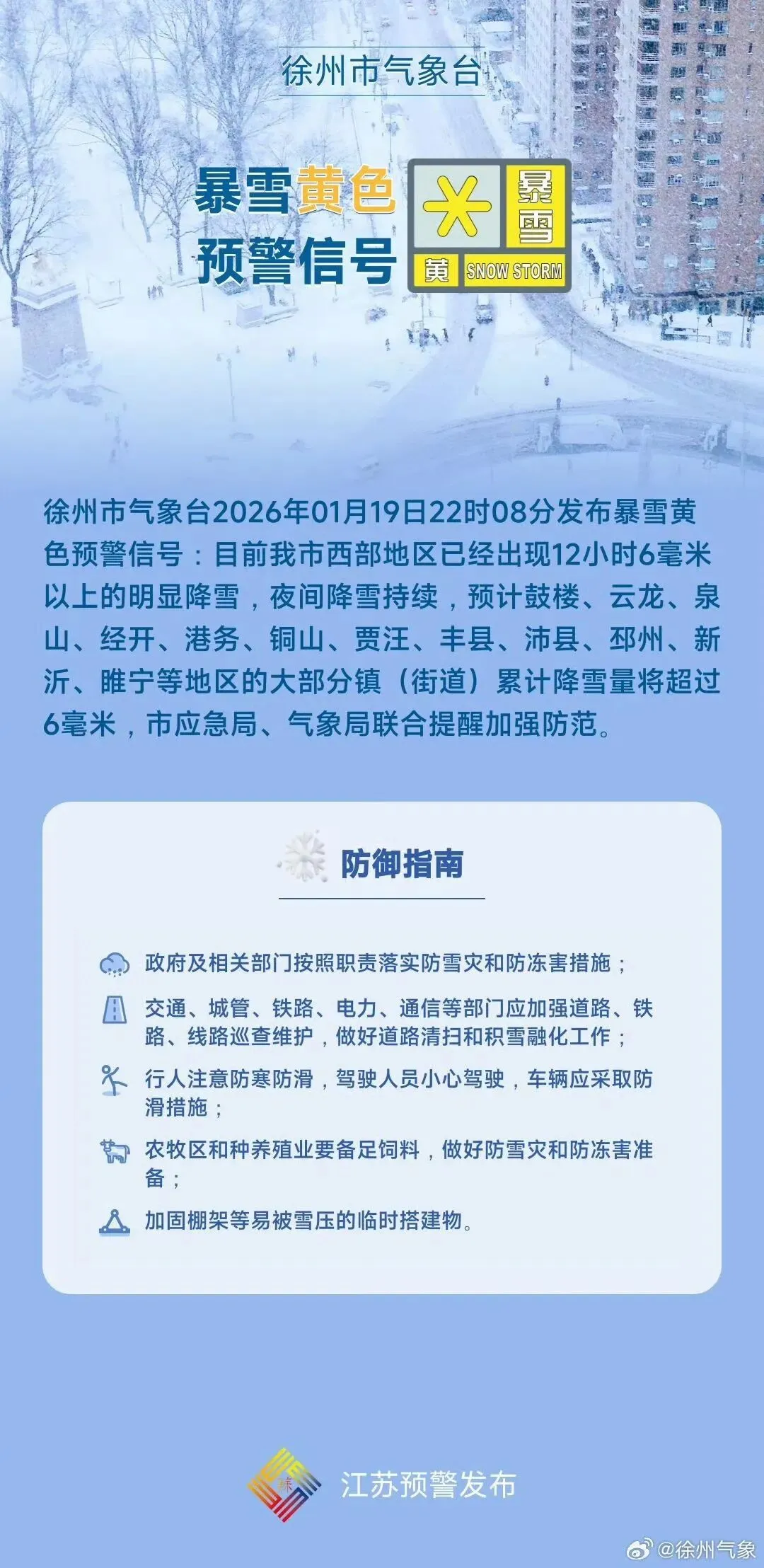 江苏省气象台2026年1月19日15时55分已发布道路结冰黄色预警,预计未来24小时,南京、无锡、徐州、常州、苏州、南通、连云港、淮安、盐城、扬州、镇江、泰州、宿迁全域将出现对交通有影响的道路结冰,其中徐州受影响较为严重。此外,今日全省陆上阵风达7~8级,江河湖库、沿海海区阵风8~9级,大风天气将进一步加剧寒意。