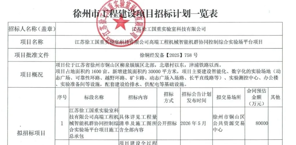 从招标计划中可以看到,项目完整名字叫:徐工国重实验室科技有限公司高端工程机械智能机群协同控制综合实验场平台。