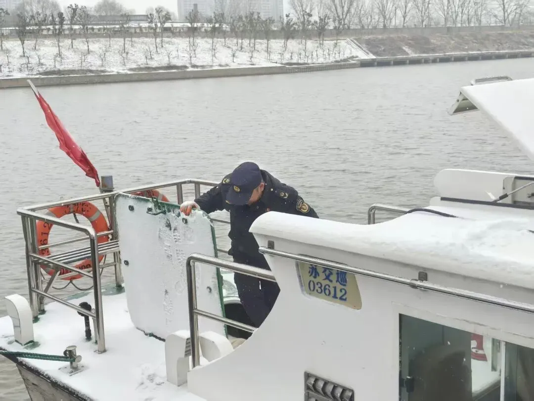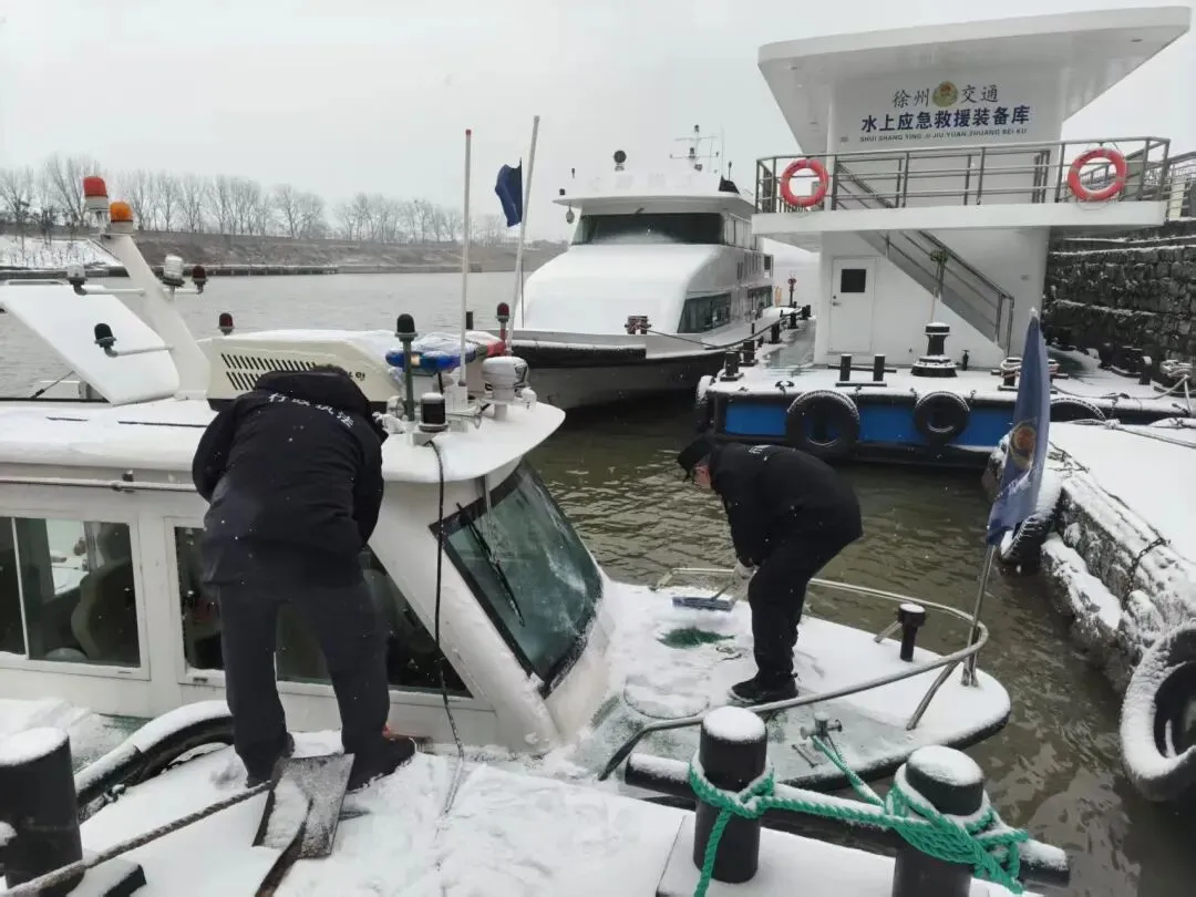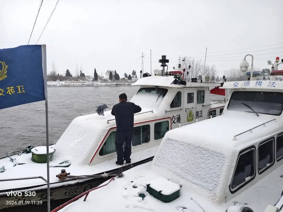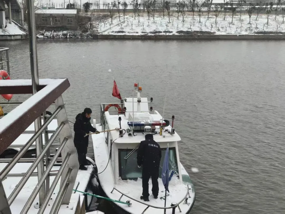 寒风凛冽,雪花纷飞。在京杭运河徐州段等关键水域,水上执法大队的执法人员早已开始忙碌。他们仔细对执法巡逻艇进行出航前的全面除雪作业,并一丝不苟地检查艇上设备是否完好。通过严格执行发动机“温车”、关键设备“盖被”等一系列防冻保暖操作规程,确保每一艘交巡艇都处于良好的适航与应急待命状态,为应对可能的水上突发情况做好万全准备。