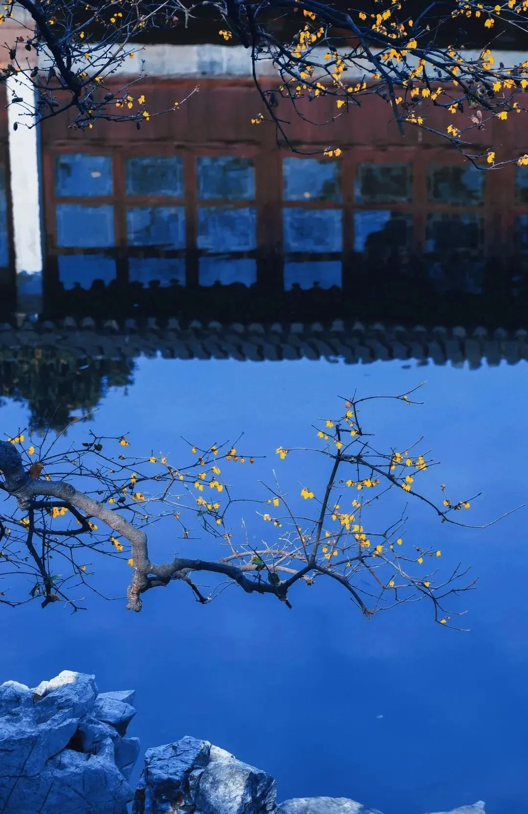 晴天的时候,池水会把天空的蓝完整收进去。于是你会看到——金黄的花、湛蓝的水、灰白的石头,三种颜色安静地站在同一帧里。